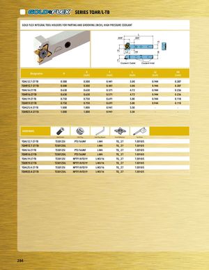 PART SERIES SERIES TQHR/L-TB PGAORLTDSFELREIXESINTEGRAL TOOL HOLDERS FOR PARTING AND GROOVING (INCH), HIGH PRESSURE COOLANT L .906” .335” H H L2 H4 B F Coolant Outlet Coolant Inlet Designation H B F L L2 H4(inch)(inch)(inch)(inch)(inch) TQHL12.7-27-TB 0.500 0.500 0.441 5.00 0.944 0.287 PTlaQcHeRh1o2l.d7-e2r7-TB 0.500 0.500 0.441 5.00 0.944 0.287 TQHL16-27-TB 0.630 0.630 0.571 4.72 0.944 0.236 TQHR16-27-TB 0.630 0.630 0.571 4.72 0.944 0.236 TQHL19-27-TB 0.750 0.750 0.691 5.00 0.944 0.118 TQHR19-27-TB 0.750 0.750 0.691 5.00 0.944 0.118 TQHL25.4-27-TB 1.000 1.000 0.941 5.50 - - TQHR25.4-27-TB 1.000 1.000 0.941 5.50 - - HARDWARE Insert Screw Inlet Plug Inlet Plug Wrench Insert Reference Torx Driver TQHL12.7-27-TB TS50125I PT5/16UNF L-W4 TQ_ 27 T-2010/5 TQHR12.7-27-TB TS50125IL - L-W4 TQ_ 27 T-2010/5 TQHL16-27-TB TS50125I PT5/16UNF L-W4 TQ_ 27 T-2010/5 TQHR16-27-TB TS50125IL PT5/16UNF L-W4 TQ_ 27 T-2010/5 TQHL19-27-TB TS50125I NPTF1/8-TQ19 L-W3/16 TQ_ 27 T-2010/5 TQHR19-27-TB TS50125IL NPTF1/8-TQ19 L-W3/16 TQ_ 27 T-2010/5 TQHL25.4-27-TB TS50125I NPTF1/8-TQ19 L-W3/16 TQ_ 27 T-2010/5 TQHR25.4-27-TB TS50125IL NPTF1/8-TQ19 L-W3/16 TQ_ 27 T-2010/5 HARDWARE hardware desc 1 hardware desc 2 hardware desc 3 hardware desc 4 hardware desc 5 hardware desc 6 hardware desc 7 284