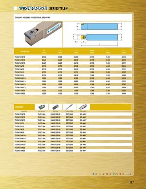 SERIES TTLEN T-GROOVE HOLDERS FOR EXTERNAL GROOVING H H F B W T L Designation H B F Tmax L A(inch)(inch)(inch)(inch)(inch)(inch) TTLEN12.7K10 0.500 0.500 0.450 0.790 5.00 0.394 TTLEN15.9K10 0.625 0.625 0.510 0.790 5.00 0.394 TTLEN15.9K15 0.625 0.625 0.610 0.790 5.00 0.591 TTLEN19M10 0.750 0.750 0.570 0.790 6.00 0.394 TTLEN19M15 0.750 0.750 0.670 0.790 6.00 0.591 TTLEN19K20 0.750 0.750 0.770 1.380 5.00 0.787 TTLEN19K25 0.750 0.750 0.870 1.380 5.00 0.984 TTLEN25.4M10 1.000 1.000 0.700 0.790 6.00 0.394 TTLEN25.4M15 1.000 1.000 0.800 0.790 6.00 0.591 TTLEN25.4M20 1.000 1.000 0.890 1.380 6.00 0.787 TTLEN25.4M25 1.000 1.000 0.990 1.380 6.00 0.984 TTLEN31.8P20 1.250 1.250 1.020 1.380 7.00 0.787 TTLEN31.8P25 1.250 1.250 1.120 1.380 7.00 0.984 HARDWARE Turning Holder Insert Reference Insert Screw Screw Driver Blade Driver Handle TTLEN12.7K10 TGUX1004 SM40-100-R0 DS-T156B DS-A00T TTLEN15.9K10 TGUX1004 SM40-100-R0 DS-T156B DS-A00T TTLEN15.9K15 TGUX1504 SM40-100-R0 DS-T156B DS-A00T TTLEN19K20 TGUX2006 SM45-120-R0 DS-T206B DS-A00T TTLEN19K25 TGUX2506 SM45-120-R0 DS-T206B DS-A00T TTLEN19M10 TGUX1004 SM40-100-R0 DS-T156B DS-A00T TTLEN19M15 TGUX1504 SM40-100-R0 DS-T156B DS-A00T TTLEN25.4M10 TGUX1004 SM40-100-R0 DS-T156B DS-A00T TTLEN25.4M15 TGUX1504 SM40-100-R0 DS-T156B DS-A00T TTLEN25.4M20 TGUX2006 SM45-120-R0 DS-T206B DS-A00T TTLEN25.4M25 TGUX2506 SM45-120-R0 DS-T206B DS-A00T TTLEN31.8P20 TGUX2006 SM45-120-R0 DS-T206B DS-A00T TTLEN31.8P25 TGUX2506 SM45-120-R0 DS-T206B DS-A00T =P =M =K =N =S =H 287
