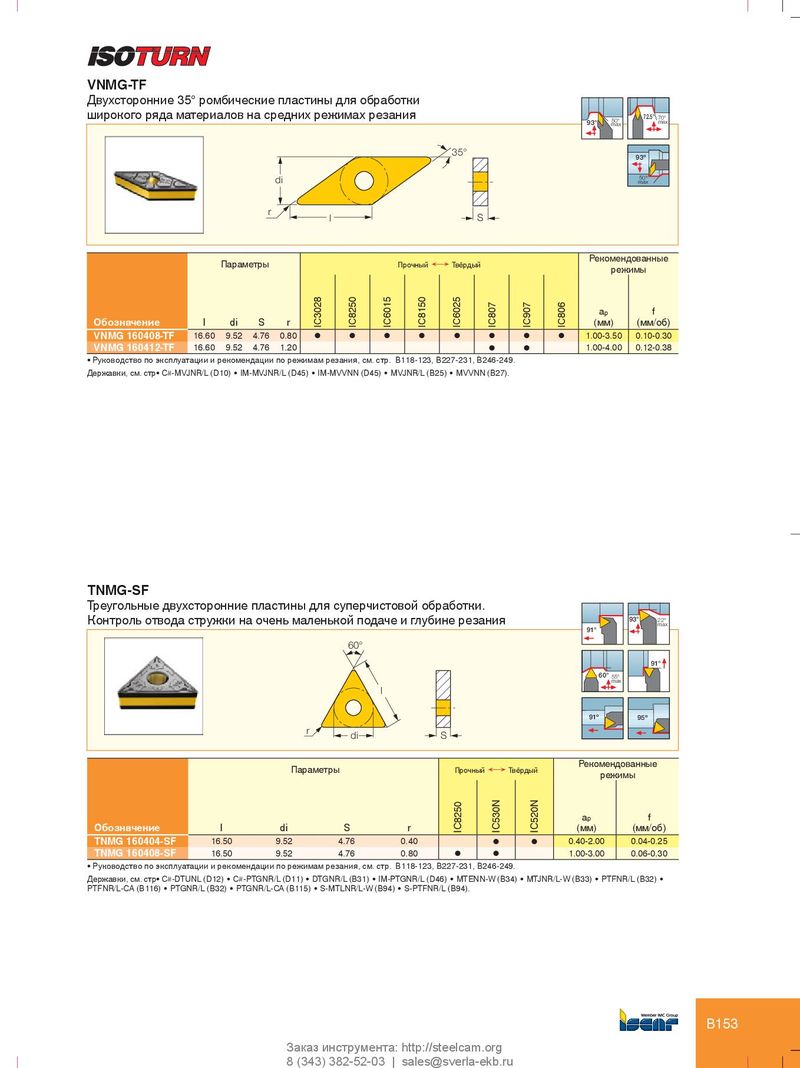 VNMG-TF Двухсторонние 35° ромбические пластины для обработки широкого ряда материалов на средних режимах резания 50° 72.5° 70° 93° max max 35° 93º 50º di max r l S Рекомендованные Параметры Прочный Ö Твёрдый режимы a p f Обозначение l di S r IC3028 IC8250 IC6015 IC8150 IC6025 IC807 IC907 IC806 (мм) (мм/об) VNMG 160408-TF 16.60 9.52 4.76 0.80 l l l l l l l l 1.00-3.50 0.10-0.30 VNMG 160412-TF 16.60 9.52 4.76 1.20 l l 1.00-4.00 0.12-0.38 • Руководство по эксплуатации и рекомендации по режимам резания, см. стр. B118-123, B227-231, B246-249. Державки, см. стр• C#-MVJNR/L (D10) • IM-MVJNR/L (D45) • IM-MVVNN (D45) • MVJNR/L (B25) • MVVNN (B27). TNMG-SF Треугольные двухсторонние пластины для суперчистовой обработки. Контроль отвода стружки на очень маленькой подаче и глубине резания 93° 22° max 91° 60° 91° 60° 55° max l 91º 95º r di S Рекомендованные Параметры Прочный Ö Твёрдый режимы a p f Обозначение l di S r IC8250 IC530N IC520N (мм) (мм/об) TNMG 160404-SF 16.50 9.52 4.76 0.40 l l 0.40-2.00 0.04-0.25 TNMG 160408-SF 16.50 9.52 4.76 0.80 l l 1.00-3.00 0.06-0.30 • Руководство по эксплуатации и рекомендации по режимам резания, см. стр. B118-123, B227-231, B246-249. Державки, см. стр• C#-DTUNL (D12) • C#-PTGNR/L (D11) • DTGNR/L (B31) • IM-PTGNR/L (D46) • MTENN-W (B34) • MTJNR/L-W (B33) • PTFNR/L (B32) • PTFNR/L-CA (B116) • PTGNR/L (B32) • PTGNR/L-CA (B115) • S-MTLNR/L-W (B94) • S-PTFNR/L (B94). B153 Заказ инструмента: http://steelcam.org 8 (343) 382-52-03 | sales@sverla-ekb.ru