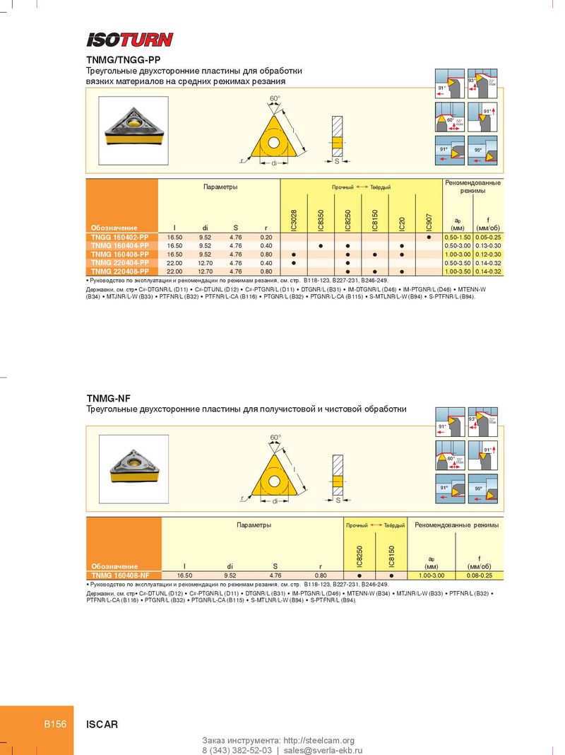 TNMG/TNGG-PP Треугольные двухсторонние пластины для обработки вязких материалов на средних режимах резания 93° 22° max 91° 60° 91° 60° 55° max l 91º 95º r di S Рекомендованные Параметры Прочный Ö Твёрдый режимы a p f Обозначение l di S r IC3028 IC8350 IC8250 IC8150 IC20 IC907 (мм) (мм/об) TNGG 160402-PP 16.50 9.52 4.76 0.20 l 0.50-1.50 0.05-0.25 TNMG 160404-PP 16.50 9.52 4.76 0.40 l l l 0.50-3.00 0.13-0.30 TNMG 160408-PP 16.50 9.52 4.76 0.80 l l l l 1.00-3.00 0.12-0.30 TNMG 220404-PP 22.00 12.70 4.76 0.40 l l 0.50-3.50 0.14-0.32 TNMG 220408-PP 22.00 12.70 4.76 0.80 l l l 1.00-3.50 0.14-0.32 • Руководство по эксплуатации и рекомендации по режимам резания, см. стр. B118-123, B227-231, B246-249. Державки, см. стр• C#-DTGNR/L (D11) • C#-DTUNL (D12) • C#-PTGNR/L (D11) • DTGNR/L (B31) • IM-DTGNR/L (D46) • IM-PTGNR/L (D46) • MTENN-W (B34) • MTJNR/L-W (B33) • PTFNR/L (B32) • PTFNR/L-CA (B116) • PTGNR/L (B32) • PTGNR/L-CA (B115) • S-MTLNR/L-W (B94) • S-PTFNR/L (B94). TNMG-NF Треугольные двухсторонние пластины для получистовой и чистовой обработки 93° 22° max 91° 60° 91° 60° 55° max l 91º 95º r di S Параметры Прочный Ö Твёрдый Рекомендованные режимы a p f Обозначение l di S r IC8250 IC8150 (мм) (мм/об) TNMG 160408-NF 16.50 9.52 4.76 0.80 l l 1.00-3.00 0.08-0.25 • Руководство по эксплуатации и рекомендации по режимам резания, см. стр. B118-123, B227-231, B246-249. Державки, см. стр• C#-DTUNL (D12) • C#-PTGNR/L (D11) • DTGNR/L (B31) • IM-PTGNR/L (D46) • MTENN-W (B34) • MTJNR/L-W (B33) • PTFNR/L (B32) • PTFNR/L-CA (B116) • PTGNR/L (B32) • PTGNR/L-CA (B115) • S-MTLNR/L-W (B94) • S-PTFNR/L (B94). B156 ISCAR Заказ инструмента: http://steelcam.org 8 (343) 382-52-03 | sales@sverla-ekb.ru