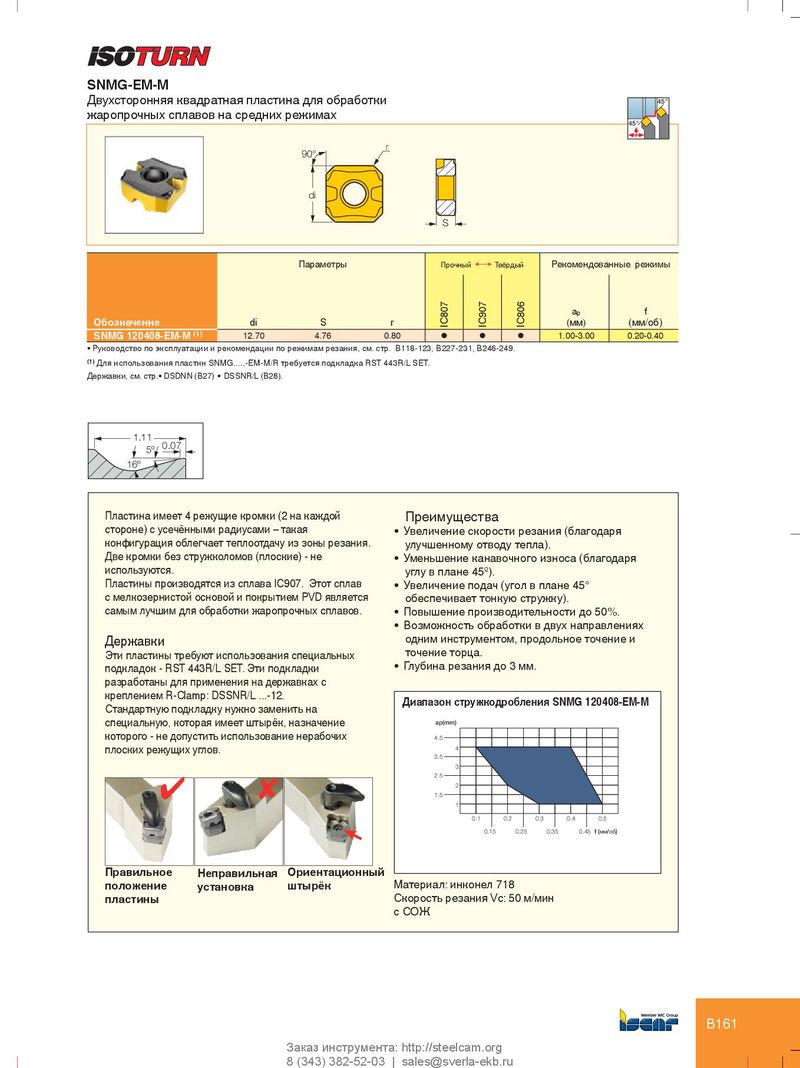 SNMG-EM-M Двухсторонняя квадратная пластина для обработки 45° жаропрочных сплавов на средних режимах 45° r 90° di S Параметры Прочный Ö Твёрдый Рекомендованные режимы a p f Обозначение di S r IC807 IC907 IC806 (мм) (мм/об) SNMG 120408-EM-M (1) 12.70 4.76 0.80 l l l 1.00-3.00 0.20-0.40 • Руководство по эксплуатации и рекомендации по режимам резания, см. стр. B118-123, B227-231, B246-249. (1) Для использования пластин SNMG.....-EM-M/R требуется подкладка RST 443R/L SET. Державки, см. стр.• DSDNN (B27) • DSSNR/L (B28). 1.11 0.07 5º 16º Пластина имеет 4 режущие кромки (2 на каждой Преимущества стороне) с усечёнными радиусами – такая • Увеличение скорости резания (благодаря конфигурация облегчает теплоотдачу из зоны резания. улучшенному отводу тепла). Две кромки без стружколомов (плоские) - не • Уменьшение канавочного износа (благодаря используются. углу в плане 45º). Пластины производятся из сплава IC907. Этот сплав • Увеличение подач (угол в плане 45° с мелкозернистой основой и покрытием PVD является обеспечивает тонкую стружку). самым лучшим для обработки жаропрочных сплавов. • Повышение производительности до 50%. • Возможность обработки в двух направлениях Державки одним инструментом, продольное точение и Эти пластины требуют использования специальных точение торца. подкладок - RST 443R/L SET. Эти подкладки • Глубина резания до 3 мм. разработаны для применения на державках с креплением R-Clamp: DSSNR/L ...-12. Диапазон стружкодробления SNMG 120408-EM-M Стандартную подкладку нужно заменить на специальную, которая имеет штырёк, назначение ap(mm) которого - не допустить использование нерабочих 4.5 плоских режущих углов. 4 3.5 3 2.5 2 4 8 1.5 1 0.1 0.2 0.3 0.4 0.5 0.15 0.25 0.35 0.45 f (мм/об) Правильное Неправильная Ориентационный положение установка штырёк Материал: инконел 718 пластины Скорость резания Vc: 50 м/мин с СОЖ B161 Заказ инструмента: http://steelcam.org 8 (343) 382-52-03 | sales@sverla-ekb.ru