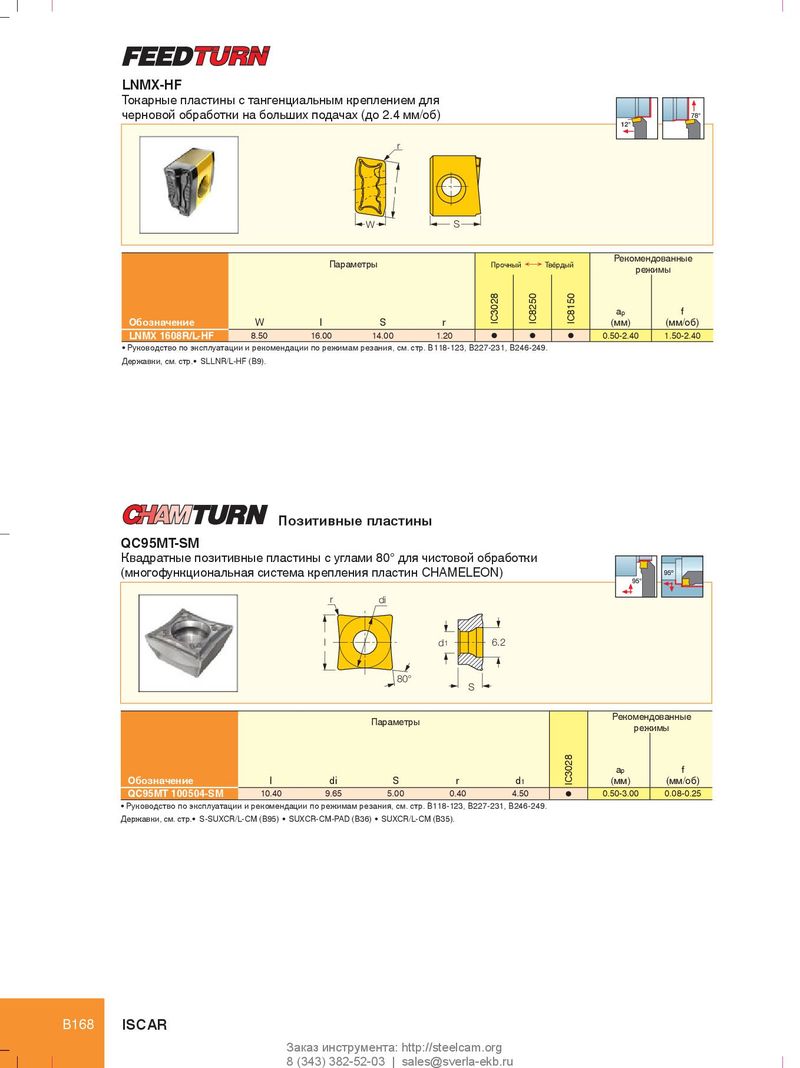 LNMX-HF Токарные пластины с тангенциальным креплением для черновой обработки на больших подачах (до 2.4 мм/об) 78° 12° r I W S Рекомендованные Параметры Прочный Ö Твёрдый режимы a p f Обозначение W l S r IC3028 IC8250 IC8150 (мм) (мм/об) LNMX 1608R/L-HF 8.50 16.00 14.00 1.20 l l l 0.50-2.40 1.50-2.40 • Руководство по эксплуатации и рекомендации по режимам резания, см. стр. B118-123, B227-231, B246-249. Державки, см. стр.• SLLNR/L-HF (B9). Позитивные пластины QC95MT-SM Квадратные позитивные пластины с углами 80° для чистовой обработки (многофункциональная система крепления пластин CHAMELEON) 95º 95° r di l d 1 6.2 80° S Рекомендованные Параметры режимы a p f Обозначение l di S r d 1 IC3028 (мм) (мм/об) QC95MT 100504-SM 10.40 9.65 5.00 0.40 4.50 l 0.50-3.00 0.08-0.25 • Руководство по эксплуатации и рекомендации по режимам резания, см. стр. B118-123, B227-231, B246-249. Державки, см. стр.• S-SUXCR/L-CM (B95) • SUXCR-CM-PAD (B36) • SUXCR/L-CM (B35). B168 ISCAR Заказ инструмента: http://steelcam.org 8 (343) 382-52-03 | sales@sverla-ekb.ru