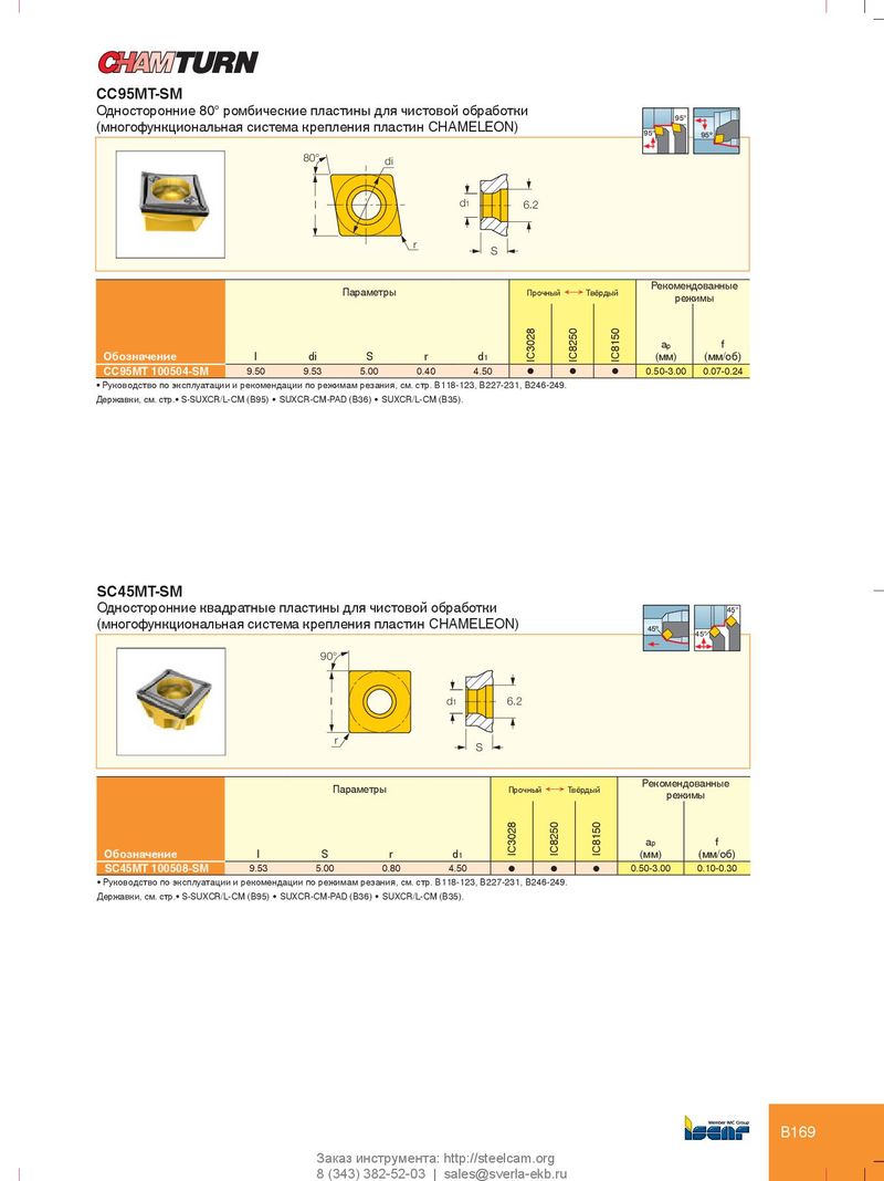 CC95MT-SM Односторонние 80° ромбические пластины для чистовой обработки 95° (многофункциональная система крепления пластин CHAMELEON) 95° 95º 80° di l d 1 6.2 r S Рекомендованные Параметры Прочный Ö Твёрдый режимы a p f Обозначение l di S r d 1 IC3028 IC8250 IC8150 (мм) (мм/об) CC95MT 100504-SM 9.50 9.53 5.00 0.40 4.50 l l l 0.50-3.00 0.07-0.24 • Руководство по эксплуатации и рекомендации по режимам резания, см. стр. B118-123, B227-231, B246-249. Державки, см. стр.• S-SUXCR/L-CM (B95) • SUXCR-CM-PAD (B36) • SUXCR/L-CM (B35). SC45MT-SM Односторонние квадратные пластины для чистовой обработки 45° (многофункциональная система крепления пластин CHAMELEON) 45º 45° 90° I d 1 6.2 r S Рекомендованные Параметры Прочный Ö Твёрдый режимы a p f Обозначение l S r d 1 IC3028 IC8250 IC8150 (мм) (мм/об) SC45MT 100508-SM 9.53 5.00 0.80 4.50 l l l 0.50-3.00 0.10-0.30 • Руководство по эксплуатации и рекомендации по режимам резания, см. стр. B118-123, B227-231, B246-249. Державки, см. стр.• S-SUXCR/L-CM (B95) • SUXCR-CM-PAD (B36) • SUXCR/L-CM (B35). B169 Заказ инструмента: http://steelcam.org 8 (343) 382-52-03 | sales@sverla-ekb.ru