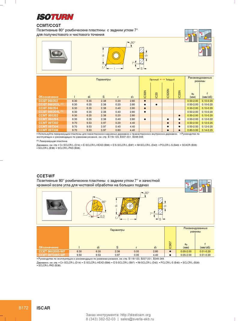 CCMT/CCGT Позитивные 80° ромбические пластины с задним углом 7° 95° для получистового и чистового точения 95° 95º 80° 97° 93° di d 1 7° r l S Рекомендованные Параметры Прочный Ö Твёрдый режимы a p f Обозначение l di S r d 1 IC30N IC20 IC520N IC20N (мм) (мм/об) CCGT 060202 6.30 6.35 2.38 0.20 2.80 l 0.50-2.00 0.10-0.20 CCGT 060202L (1) 6.30 6.35 2.38 0.20 2.80 l l 0.50-2.00 0.10-0.20 CCGT 060204 6.30 6.35 2.38 0.40 2.80 l 0.50-2.00 0.10-0.20 CCGT 060204L (1) 6.30 6.35 2.38 0.40 2.80 l 0.50-2.00 0.10-0.20 CCMT 060202 6.30 6.35 2.38 0.20 2.80 l 0.50-2.00 0.10-0.20 CCMT 060204 6.30 6.35 2.38 0.40 2.80 l l l 0.50-2.00 0.12-0.22 CCMT 09T302 9.70 9.53 3.97 0.20 4.40 l l 0.50-2.50 0.12-0.25 CCMT 09T304 9.70 9.53 3.97 0.40 4.40 l l 0.50-2.50 0.12-0.25 CCMT 09T308 9.70 9.53 3.97 0.80 4.40 l l 0.80-3.00 0.14-0.25 • Используйте леворежущие пластины для левосторонних наружных державок и правосторонних внутренних державок. • Руководство по эксплуатации и рекомендации по режимам резания, см. стр. B118-123, B227-231, B246-249. (1) Леворежущая пластина Державки, см. стр.• C#-SCLCR/L (D14) • E-SCLCR/L-HEAD (B96) • E/S-SCLCR/L (B97) • IM-SCLCR/L (D42) • PCLCR/L-S (B40) • SCACR (B39) • SCLCR/L (B38) • SCLCR/L-PAD (B38). CCET-WF Позитивные 80° ромбические пластины с задним углом 7° и зачистной 95° кромкой возле угла для чистовой обработки на больших подачах 95º 95° 80° 86° di d 1 r 7° 0.3 r l S Рекомендованные Параметры режимы a p f Обозначение l di S r d 1 IC907 (мм) (мм/об) CCET 0602005-WF 6.30 6.35 2.38 0.05 2.80 l 0.05-2.00 0.01-0.20 CCET 09T3005-WF 9.50 9.53 3.97 0.05 4.40 l 0.05-2.00 0.01-0.20 • Руководство по эксплуатации и рекомендации по режимам резания, см. стр. B118-123, B227-231, B246-249. Державки, см. стр. • C#-SCLCR/L (D14) • E-SCLCR/L-HEAD (B96) • E/S-SCLCR/L (B97) • IM-SCLCR/L (D42) • PCLCR/L-S (B40) • SCLCR/L (B38) • SCLCR/L-PAD (B38). B172 ISCAR Заказ инструмента: http://steelcam.org 8 (343) 382-52-03 | sales@sverla-ekb.ru