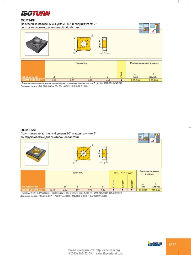 QCMT-PF Позитивные пластины с 4 углами 80° и задним углом 7° со стружколомом для чистовой обработки 95º 95° di l d 1 r S Параметры Рекомендованные режимы a p f Обозначение di S r d 1 IC908 (мм) (мм/об) QCMT 09T302-PF 9.65 3.97 0.20 4.40 l 0.50-2.50 0.05-0.30 • Руководство по эксплуатации и рекомендации по режимам резания, см. стр. B118-123, B227-231, B246-249. Державки, см. стр.• PQLCR/L (B37) • PQLCR/L-A (B37) • PQLCR/L-S (B36). QCMT-SM Позитивные пластины с 4 углами 80° и задним углом 7° со стружколомом для чистовой обработки 95º 95° di l d 1 r S Рекомендованные Параметры Прочный Ö Твёрдый режимы a p f Обозначение l di S r d 1 IC3028 IC8250 IC8150 (мм) (мм/об) QCMT 09T304-SM 10.40 9.65 3.97 0.40 4.40 l l l 0.50-2.50 0.06-0.25 • Руководство по эксплуатации и рекомендации по режимам резания, см. стр. B118-123, B227-231, B246-249. Державки, см. стр.• PQLCR/L (B37) • PQLCR/L-A (B37) • PQLCR/L-S (B36) • S/A-SQLCR/L (B96). B177 Заказ инструмента: http://steelcam.org 8 (343) 382-52-03 | sales@sverla-ekb.ru