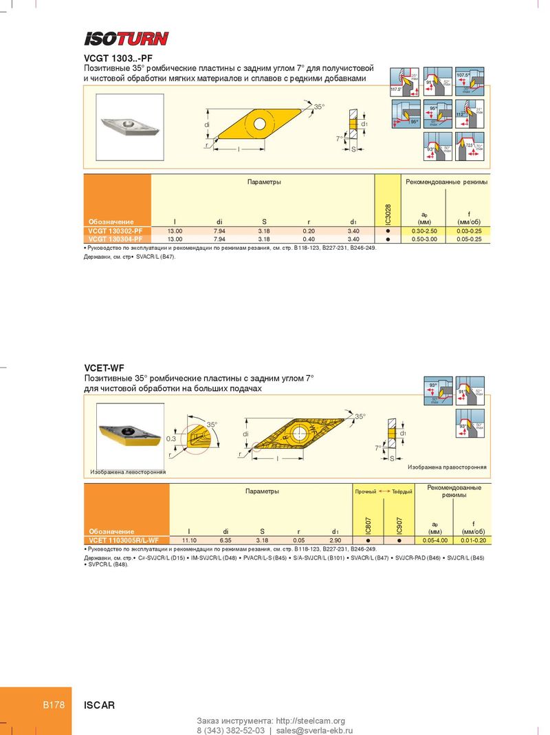 VCGT 1303..-PF Позитивные 35° ромбические пластины с задним углом 7° для получистовой 25° 107.5º и чистовой обработки мягких материалов и сплавов с редкими добавками max 91° 52° max 117.5° 35º max 35° 95º 31° max 112° 95º 48º di d 1 max 7° r l S 50° 72.5° 70° 93° max max Параметры Рекомендованные режимы a p f Обозначение l di S r d 1 IC3028 (мм) (мм/об) VCGT 130302-PF 13.00 7.94 3.18 0.20 3.40 l 0.30-2.50 0.03-0.25 VCGT 130304-PF 13.00 7.94 3.18 0.40 3.40 l 0.50-3.00 0.05-0.25 • Руководство по эксплуатации и рекомендации по режимам резания, см. стр. B118-123, B227-231, B246-249. Державки, см. стр• SVACR/L (B47). VCET-WF Позитивные 35° ромбические пластины с задним углом 7° 93º для чистовой обработки на больших подачах 91° 52° max 50º max 35° 35° WF 93° 50° max di d 1 0.3 R 7° r r l S Изображена правосторонняя Изображена левосторонняя Рекомендованные Параметры Прочный Ö Твёрдый режимы a p f Обозначение l di S r d 1 IC807 IC907 (мм) (мм/об) VCET 1103005R/L-WF 11.10 6.35 3.18 0.05 2.90 l l 0.05-4.00 0.01-0.20 • Руководство по эксплуатации и рекомендации по режимам резания, см. стр. B118-123, B227-231, B246-249. Державки, см. стр.• C#-SVJCR/L (D15) • IM-SVJCR/L (D48) • PVACR/L-S (B45) • S/A-SVJCR/L (B101) • SVACR/L (B47) • SVJCR-PAD (B46) • SVJCR/L (B45) • SVPCR/L (B48). B178 ISCAR Заказ инструмента: http://steelcam.org 8 (343) 382-52-03 | sales@sverla-ekb.ru