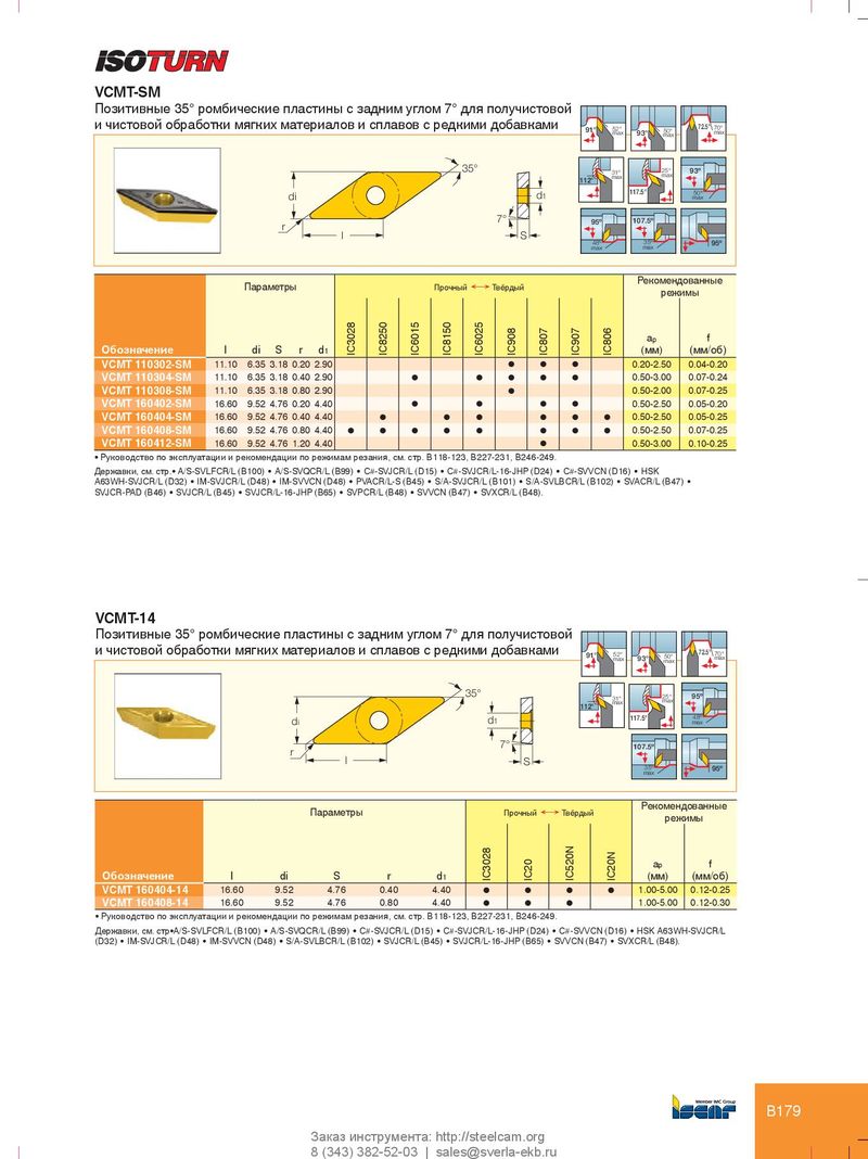 VCMT-SM Позитивные 35° ромбические пластины с задним углом 7° для получистовой и чистовой обработки мягких материалов и сплавов с редкими добавками 91° 52° max 50° 72.5° 70° 93° max max 35° 31° 25° max max 93º 112° 117.5° 50º di d 1 max 7° 95º 107.5º r l S 48º 35º 95º max max Рекомендованные Параметры Прочный Ö Твёрдый режимы a p f Обозначение l di S r d 1 IC3028 IC8250 IC6015 IC8150 IC6025 IC908 IC807 IC907 IC806 (мм) (мм/об) VCMT 110302-SM 11.10 6.35 3.18 0.20 2.90 l l l 0.20-2.50 0.04-0.20 VCMT 110304-SM 11.10 6.35 3.18 0.40 2.90 l l l l l 0.50-3.00 0.07-0.24 VCMT 110308-SM 11.10 6.35 3.18 0.80 2.90 l 0.50-2.00 0.07-0.25 VCMT 160402-SM 16.60 9.52 4.76 0.20 4.40 l l l l 0.50-2.50 0.05-0.20 VCMT 160404-SM 16.60 9.52 4.76 0.40 4.40 l l l l l l 0.50-2.50 0.05-0.25 VCMT 160408-SM 16.60 9.52 4.76 0.80 4.40 l l l l l l l l 0.50-2.50 0.07-0.25 VCMT 160412-SM 16.60 9.52 4.76 1.20 4.40 l 0.50-3.00 0.10-0.25 • Руководство по эксплуатации и рекомендации по режимам резания, см. стр. B118-123, B227-231, B246-249. Державки, см. стр.• A/S-SVLFCR/L (B100) • A/S-SVQCR/L (B99) • C#-SVJCR/L (D15) • C#-SVJCR/L-16-JHP (D24) • C#-SVVCN (D16) • HSK A63WH-SVJCR/L (D32) • IM-SVJCR/L (D48) • IM-SVVCN (D48) • PVACR/L-S (B45) • S/A-SVJCR/L (B101) • S/A-SVLBCR/L (B102) • SVACR/L (B47) • SVJCR-PAD (B46) • SVJCR/L (B45) • SVJCR/L-16-JHP (B65) • SVPCR/L (B48) • SVVCN (B47) • SVXCR/L (B48). VCMT-14 Позитивные 35° ромбические пластины с задним углом 7° для получистовой и чистовой обработки мягких материалов и сплавов с редкими добавками 91° 52° max 50° 72.5° 70° 93° max max 35° 31° 25° 95º max max 112° 117.5° 48º di d 1 max 7° 107.5º r l S 35º max 95º Рекомендованные Параметры Прочный Ö Твёрдый режимы a p f Обозначение l di S r d 1 IC3028 IC20 IC520N IC20N (мм) (мм/об) VCMT 160404-14 16.60 9.52 4.76 0.40 4.40 l l l l 1.00-5.00 0.12-0.25 VCMT 160408-14 16.60 9.52 4.76 0.80 4.40 l l l 1.00-5.00 0.12-0.30 • Руководство по эксплуатации и рекомендации по режимам резания, см. стр. B118-123, B227-231, B246-249. Державки, см. стр•A/S-SVLFCR/L (B100) • A/S-SVQCR/L (B99) • C#-SVJCR/L (D15) • C#-SVJCR/L-16-JHP (D24) • C#-SVVCN (D16) • HSK A63WH-SVJCR/L (D32) • IM-SVJCR/L (D48) • IM-SVVCN (D48) • S/A-SVLBCR/L (B102) • SVJCR/L (B45) • SVJCR/L-16-JHP (B65) • SVVCN (B47) • SVXCR/L (B48). B179 Заказ инструмента: http://steelcam.org 8 (343) 382-52-03 | sales@sverla-ekb.ru
