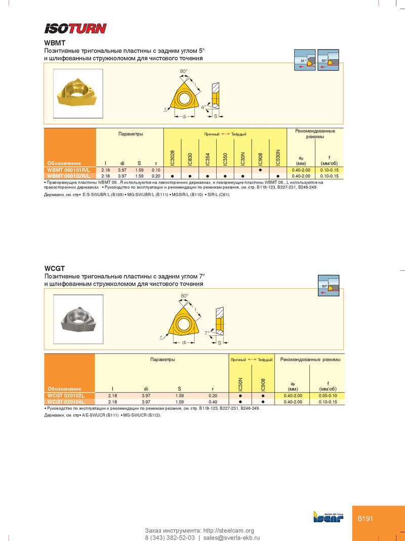 WBMT Позитивные тригональные пластины с задним углом 5° и шлифованным стружколомом для чистового точения 91° 93º 80° l r a° di S Рекомендованные Параметры Прочный Ö Твёрдый режимы a p f Обозначение l di S r IC3028 IC830 IC354 IC350 IC30N IC908 IC530N (мм) (мм/об) WBMT 060101R/L 2.18 3.97 1.59 0.10 l 0.40-2.00 0.10-0.15 WBMT 060102R/L 2.18 3.97 1.59 0.20 l l l l l l 0.40-2.00 0.10-0.15 • Праворежущие пластины WBMT 06...R используются на левосторонних державках, и леворежущие пластины WBMT 06...L используются на правосторонних державках • Руководство по эксплуатации и рекомендации по режимам резания, см. стр. B118-123, B227-231, B246-249. Державки, см. стр• E/S-SWUBR/L (B109) • MG-SWUBR/L (B111) • MGSIR/L (B110) • SIR/L (C61). WCGT Позитивные тригональные пластины с задним углом 7° и шлифованным стружколомом для чистового точения 93º 80° l 7° r di S Параметры Прочный Ö Твёрдый Рекомендованные режимы a p f Обозначение l di S r IC30N IC908 (мм) (мм/об) WCGT 020102L 2.18 3.97 1.59 0.20 l l 0.40-2.00 0.05-0.10 WCGT 020104L 2.18 3.97 1.59 0.40 l l 0.40-2.00 0.10-0.15 • Руководство по эксплуатации и рекомендации по режимам резания, см. стр. B118-123, B227-231, B246-249. Державки, см. стр• A/E-SWUCR (B111) • MG-SWUCR (B112). B191 Заказ инструмента: http://steelcam.org 8 (343) 382-52-03 | sales@sverla-ekb.ru