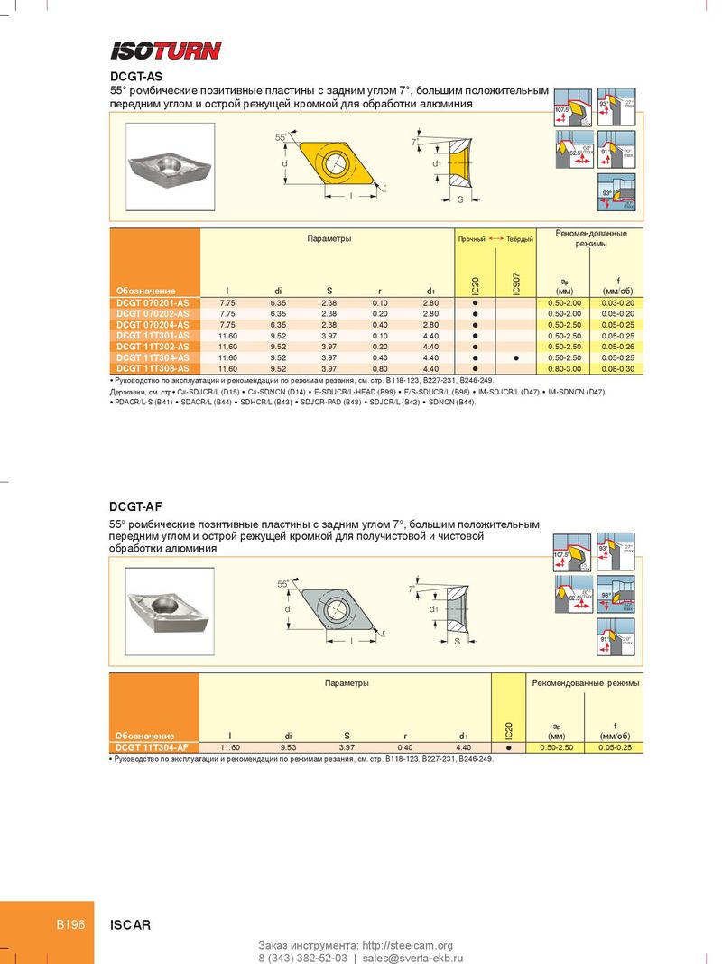 DCGT-AS 55° ромбические позитивные пластины с задним углом 7°, большим положительным передним углом и острой режущей кромкой для обработки алюминия 93° 27° max 107.5° 15∞ max 55˚ 7˚ 60° 62.5° max 91° 29° max d d 1 r 93º l S 30º max Рекомендованные Параметры Прочный Ö Твёрдый режимы a p f Обозначение l di S r d 1 IC20 IC907 (мм) (мм/об) DCGT 070201-AS 7.75 6.35 2.38 0.10 2.80 l 0.50-2.00 0.03-0.20 DCGT 070202-AS 7.75 6.35 2.38 0.20 2.80 l 0.50-2.00 0.05-0.20 DCGT 070204-AS 7.75 6.35 2.38 0.40 2.80 l 0.50-2.50 0.05-0.25 DCGT 11T301-AS 11.60 9.52 3.97 0.10 4.40 l 0.50-2.50 0.05-0.25 DCGT 11T302-AS 11.60 9.52 3.97 0.20 4.40 l 0.50-2.50 0.05-0.26 DCGT 11T304-AS 11.60 9.52 3.97 0.40 4.40 l l 0.50-2.50 0.05-0.25 DCGT 11T308-AS 11.60 9.52 3.97 0.80 4.40 l 0.80-3.00 0.08-0.30 • Руководство по эксплуатации и рекомендации по режимам резания, см. стр. B118-123, B227-231, B246-249. Державки, см. стр• C#-SDJCR/L (D15) • C#-SDNCN (D14) • E-SDUCR/L-HEAD (B99) • E/S-SDUCR/L (B98) • IM-SDJCR/L (D47) • IM-SDNCN (D47) • PDACR/L-S (B41) • SDACR/L (B44) • SDHCR/L (B43) • SDJCR-PAD (B43) • SDJCR/L (B42) • SDNCN (B44). DCGT-AF 55° ромбические позитивные пластины с задним углом 7°, большим положительным передним углом и острой режущей кромкой для получистовой и чистовой обработки алюминия 93° 27° max 107.5° 15∞ max 55˚ 7˚ 60° 62.5° max 93º 30º d d 1 max r l 91° 29° S max Параметры Рекомендованные режимы a p f Обозначение l di S r d 1 IC20 (мм) (мм/об) DCGT 11T304-AF 11.60 9.53 3.97 0.40 4.40 l 0.50-2.50 0.05-0.25 • Руководство по эксплуатации и рекомендации по режимам резания, см. стр. B118-123, B227-231, B246-249. B196 ISCAR Заказ инструмента: http://steelcam.org 8 (343) 382-52-03 | sales@sverla-ekb.ru