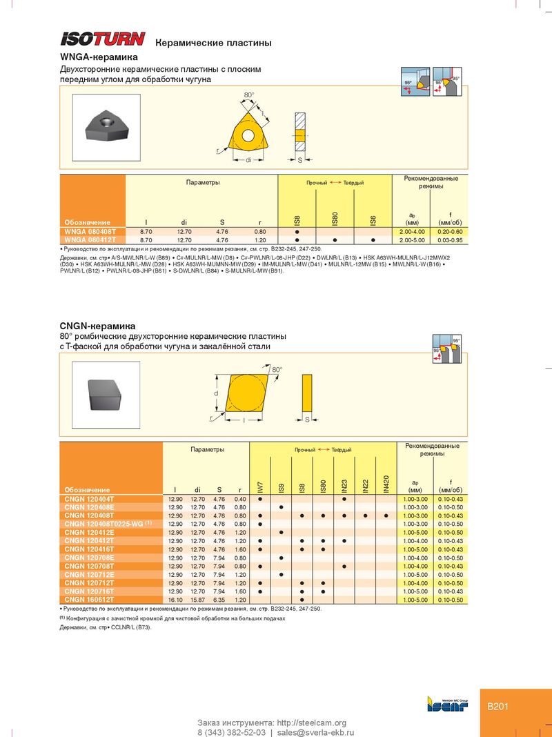 Керамические пластины WNGA-керамика Двухсторонние керамические пластины с плоским передним углом для обработки чугуна 95° 95º 95° 80° l r di S Рекомендованные Параметры Прочный Ö Твёрдый режимы a p f Обозначение l di S r IS8 IS80 IS6 (мм) (мм/об) WNGA 080408T 8.70 12.70 4.76 0.80 l 2.00-4.00 0.20-0.60 WNGA 080412T 8.70 12.70 4.76 1.20 l l l 2.00-5.00 0.03-0.95 • Руководство по эксплуатации и рекомендации по режимам резания, см. стр. B232-245, 247-250. Державки, см. стр• A/S-MWLNR/L-W (B89) • C#-MULNR/L-MW (D8) • C#-PWLNR/L-08-JHP (D22) • DWLNR/L (B13) • HSK A63WH-MULNR/L-J12MWX2 (D30) • HSK A63WH-MULNR/L-MW (D28) • HSK A63WH-MUMNN-MW (D29) • IM-MULNR/L-MW (D41) • MULNR/L-12MW (B15) • MWLNR/L-W (B16) • PWLNR/L (B12) • PWLNR/L-08-JHP (B61) • S-DWLNR/L (B84) • S-MULNR/L-MW (B91). CNGN-керамика 80° ромбические двухсторонние керамические пластины 95° с T-фаской для обработки чугуна и закалённой стали 95° 80° d r l S Рекомендованные Параметры Прочный Ö Твёрдый режимы a p f Обозначение l di S r IW7 IS9 IS8 IS80 IN23 IN22 IN420 (мм) (мм/об) CNGN 120404T 12.90 12.70 4.76 0.40 l l 1.00-3.00 0.10-0.43 CNGN 120408E 12.90 12.70 4.76 0.80 l 1.00-3.00 0.10-0.50 CNGN 120408T 12.90 12.70 4.76 0.80 l l l l l l 1.00-3.00 0.10-0.43 CNGN 120408T0225-WG (1) 12.90 12.70 4.76 0.80 l 1.00-3.00 0.10-0.50 CNGN 120412E 12.90 12.70 4.76 1.20 l 1.00-5.00 0.10-0.50 CNGN 120412T 12.90 12.70 4.76 1.20 l l l l 1.00-4.00 0.10-0.43 CNGN 120416T 12.90 12.70 4.76 1.60 l l l 1.00-5.00 0.10-0.43 CNGN 120708E 12.90 12.70 7.94 0.80 l 1.00-4.00 0.10-0.50 CNGN 120708T 12.90 12.70 7.94 0.80 l l 1.00-4.00 0.10-0.43 CNGN 120712E 12.90 12.70 7.94 1.20 l 1.00-5.00 0.10-0.50 CNGN 120712T 12.90 12.70 7.94 1.20 l l l 1.00-4.00 0.10-0.50 CNGN 120716T 12.90 12.70 7.94 1.60 l l l 1.00-5.00 0.10-0.43 CNGN 160612T 16.10 15.87 6.35 1.20 l 1.00-5.00 0.10-0.50 • Руководство по эксплуатации и рекомендации по режимам резания, см. стр. B232-245, 247-250. (1) Конфигурация с зачистной кромкой для чистовой обработки на больших подачах Державки, см. стр• CCLNR/L (B73). B201 Заказ инструмента: http://steelcam.org 8 (343) 382-52-03 | sales@sverla-ekb.ru