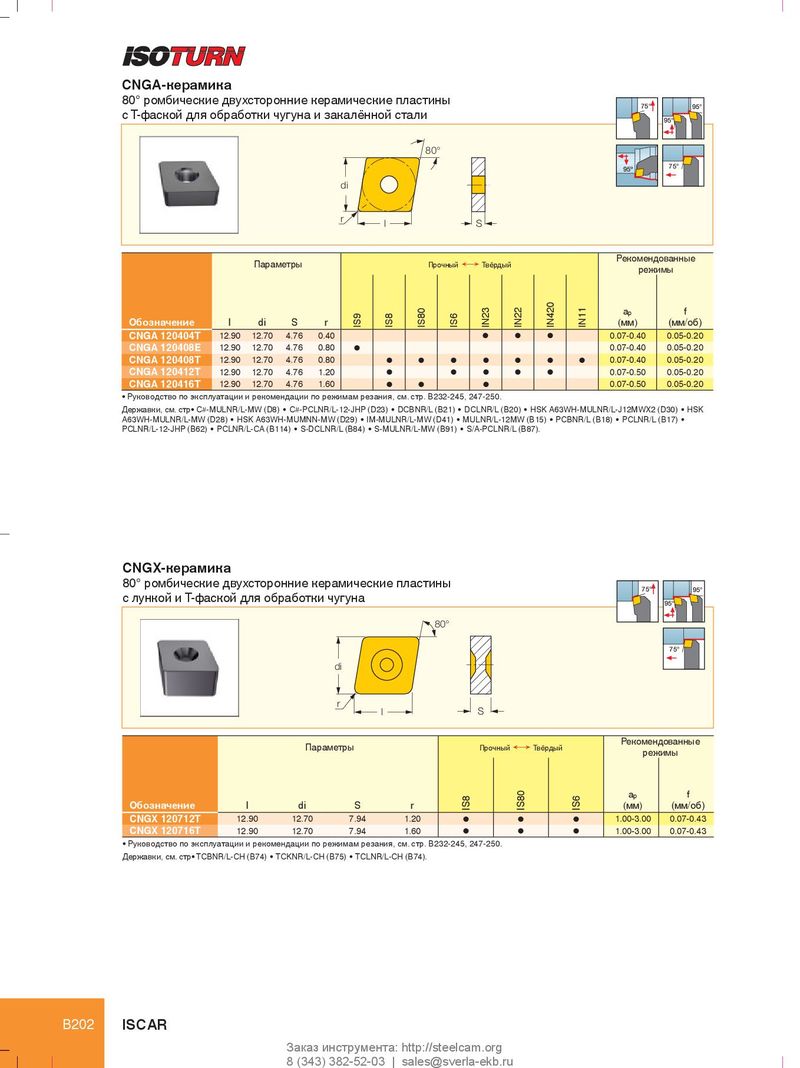 CNGA-керамика 80° ромбические двухсторонние керамические пластины 75° 95° с T-фаской для обработки чугуна и закалённой стали 95° 80° 95º 75° di r l S Рекомендованные Параметры Прочный Ö Твёрдый режимы a p f Обозначение l di S r IS9 IS8 IS80 IS6 IN23 IN22 IN420 IN11 (мм) (мм/об) CNGA 120404T 12.90 12.70 4.76 0.40 l l l 0.07-0.40 0.05-0.20 CNGA 120408E 12.90 12.70 4.76 0.80 l 0.07-0.40 0.05-0.20 CNGA 120408T 12.90 12.70 4.76 0.80 l l l l l l l 0.07-0.40 0.05-0.20 CNGA 120412T 12.90 12.70 4.76 1.20 l l l l l 0.07-0.50 0.05-0.20 CNGA 120416T 12.90 12.70 4.76 1.60 l l l 0.07-0.50 0.05-0.20 • Руководство по эксплуатации и рекомендации по режимам резания, см. стр. B232-245, 247-250. Державки, см. стр• C#-MULNR/L-MW (D8) • C#-PCLNR/L-12-JHP (D23) • DCBNR/L (B21) • DCLNR/L (B20) • HSK A63WH-MULNR/L-J12MWX2 (D30) • HSK A63WH-MULNR/L-MW (D28) • HSK A63WH-MUMNN-MW (D29) • IM-MULNR/L-MW (D41) • MULNR/L-12MW (B15) • PCBNR/L (B18) • PCLNR/L (B17) • PCLNR/L-12-JHP (B62) • PCLNR/L-CA (B114) • S-DCLNR/L (B84) • S-MULNR/L-MW (B91) • S/A-PCLNR/L (B87). CNGX-керамика 80° ромбические двухсторонние керамические пластины 75° 95° с лункой и T-фаской для обработки чугуна 95° 80° 75° di r l S Рекомендованные Параметры Прочный Ö Твёрдый режимы a p f Обозначение l di S r IS8 IS80 IS6 (мм) (мм/об) CNGX 120712T 12.90 12.70 7.94 1.20 l l l 1.00-3.00 0.07-0.43 CNGX 120716T 12.90 12.70 7.94 1.60 l l l 1.00-3.00 0.07-0.43 • Руководство по эксплуатации и рекомендации по режимам резания, см. стр. B232-245, 247-250. Державки, см. стр• TCBNR/L-CH (B74) • TCKNR/L-CH (B75) • TCLNR/L-CH (B74). B202 ISCAR Заказ инструмента: http://steelcam.org 8 (343) 382-52-03 | sales@sverla-ekb.ru