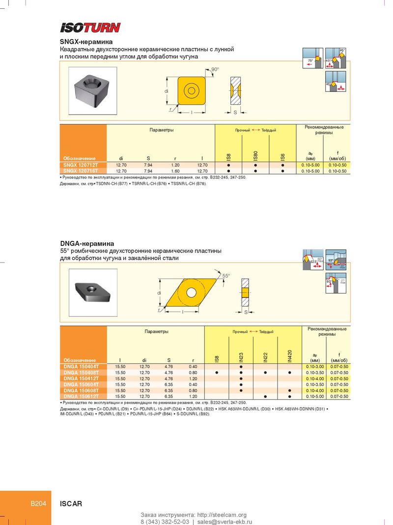 SNGX-керамика Квадратные двухсторонние керамические пластины с лункой 45° и плоским передним углом для обработки чугуна 75° 45° 90° 45° di r l S Рекомендованные Параметры Прочный Ö Твёрдый режимы a p f Обозначение di S r l IS8 IS80 IS6 (мм) (мм/об) SNGX 120712T 12.70 7.94 1.20 12.70 l l l 0.10-5.00 0.10-0.50 SNGX 120716T 12.70 7.94 1.60 12.70 l l l 0.10-5.00 0.10-0.50 • Руководство по эксплуатации и рекомендации по режимам резания, см. стр. B232-245, 247-250. Державки, см. стр• TSDNN-CH (B77) • TSRNR/L-CH (B76) • TSSNR/L-CH (B78). DNGA-керамика 55° ромбические двухсторонние керамические пластины для обработки чугуна и закалённой стали 60° 62.5° max 93º 30º max 55° 93° 27° max di r l S Рекомендованные Параметры Прочный Ö Твёрдый режимы a p f Обозначение l di S r IS8 IN23 IN22 IN420 (мм) (мм/об) DNGA 150404T 15.50 12.70 4.76 0.40 l 0.10-3.00 0.07-0.50 DNGA 150408T 15.50 12.70 4.76 0.80 l l l l 0.10-3.50 0.07-0.50 DNGA 150412T 15.50 12.70 4.76 1.20 l 0.10-4.00 0.07-0.50 DNGA 150604T 15.50 12.70 6.35 0.40 l 0.10-3.50 0.07-0.50 DNGA 150608T 15.50 12.70 6.35 0.80 l l 0.10-4.00 0.07-0.50 DNGA 150612T 15.50 12.70 6.35 1.20 l l 0.10-5.00 0.07-0.50 • Руководство по эксплуатации и рекомендации по режимам резания, см. стр. B232-245, 247-250. Державки, см. стр• C#-DDJNR/L (D9) • C#-PDJNR/L-15-JHP (D24) • DDJNR/L (B22) • HSK A63WH-DDJNR/L (D30) • HSK A63WH-DDNNN (D31) • IM-DDJNR/L (D43) • PDJNR/L (B21) • PDJNR/L-15-JHP (B64) • S-DDUNR/L (B92). B204 ISCAR Заказ инструмента: http://steelcam.org 8 (343) 382-52-03 | sales@sverla-ekb.ru