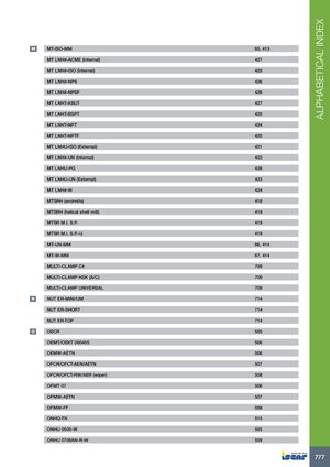 ALPHABETICAL INDEX M MT-ISO-MM 65, 413 MT LNH#-ACME (Internal) 427 MT LNH#-ISO (Internal) 420 MT LNH#-NPS 426 MT LNH#-NPSF 426 MT LNHT-ABUT 427 MT LNHT-BSPT 425 MT LNHT-NPT 424 MT LNHT-NPTF 425 MT LNHU-ISO (External) 421 MT LNH#-UN (Internal) 422 MT LNHU-PG 428 MT LNHU-UN (External) 423 MT LNH#-W 424 MTSRH (endmills) 418 MTSRH (helical shell mill) 418 MTSR M.I. S.P. 419 MTSR M.I. S.P.-U 419 MT-UN-MM 66, 414 MT-W-MM 67, 414 MULTI-CLAMP C# 709 MULTI-CLAMP HSK (A/C) 709 MULTI-CLAMP UNIVERSAL 709 N NUT ER-MINI/UM 714 NUT ER-SHORT 714 NUT ER-TOP 714 O OECR 505 OEMT/OEKT 060405 506 OEMW-AETN 506 OFCR/OFCT-AEN/AETN 507 OFCR/OFCT-RW/AER (wiper) 508 OFMT 07 506 OFMW-AETN 507 OFMW-FF 508 ONHQ-TN 515 ONHU 0505-W 505 ONHU 0706AN-R-W 509 777