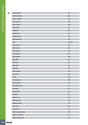 ALPHABETICAL INDEX S SD FM-S-A-SP 192 SDHT/W 100408 498 SDHT/X 120508 498 SDK-10-C/HP 249 SDK-12-C/HP 250 SD-M-N-SP 376 SDMR-HQ 497 SDMT-AD-N 513 SDMT-PDR-HQ 496 SDMT-PDR-RM 497 SDN 353, 360 SDN-CALN11 359 SDN-CALN12 356 SDN-CALN13 359 SDN-CALN15 361 SDN-CAPM15 360 SDN-LN08 354 SDN-LN12 355 SDN-XN09 357 SDN-XN13 357 SD-S-A-ER-SP 330 SD S-A-SP 329 SD-SP 328 SD TRD-M-SP 409 SD TRD-W-SP 409 SECT/SEMT 1404 512 SEHT-AFN 511 SEHW-AFTN 510 SEKN-AF.. 511 SEKR-AF..-76 512 SEKR-AF-N-42 512 SEKR-AFTR-HS 512 SEKT-AF-R 510 SEKT-AFTN 510 SEM Clamping Screws 716 SEMT 12..AFTN-76 511 SEMT 1204AF-R-HS 510 780 ISCAR