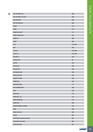 ALPHABETICAL INDEX S SET ER-SEAL-AA 696 SET ER-SEAL-AA-JET 696 SET ER-SPR 696 SET ER-SPR-AA 696 SGSA 372 SGSF 370 SGSF/A-M-JHP 371 SGSF/A-MM-JHP 372 SGSF-W 369 SGST 368 SM 312, 665 SM 250 S M-CF 313, 666 S M-C-H 312, 665 SM-XN13 246 SOE45 8/16 38 SOF45 222 SOF45-26 228 SOF45-R18 229 SOF45WG-R26 228 SOMT 0402-FF 500 SOMT/CT 0402 500 SOMT-HQ 494 SPACER STUB 717 SPCT/SPMR PDR 496 SPK 239 SPKN ED.. 513 SPKR ED..-76 513 SPKR EDTR-HS 513 SPMT-HQ 495 SRKIN PRESET SCREW 720 SSB 362 SSB-LN15-R/L 362 ST-ER 658 ST-ER-MF-D (double-ended) 661 ST-ER-MF (mini flat) 660 ST-ER-M (mini) 657 781