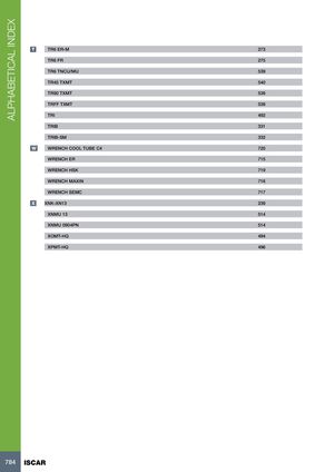 ALPHABETICAL INDEX T TR6 ER-M 273 TR6 FR 275 TR6 TNCU/MU 539 TR45 TXMT 540 TR90 TXMT 539 TRFF TXMT 539 TRI 492 TRIB 331 TRIB-SM 332 W WRENCH COOL TUBE C# 720 WRENCH ER 715 WRENCH HSK 719 WRENCH MAXIN 716 WRENCH SEMC 717 X XNK-XN13 239 XNMU 13 514 XNMU 0904PN 514 XOMT-HQ 494 XPMT-HQ 496 784 ISCAR