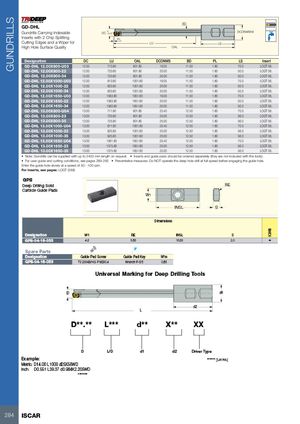GUNDRILLS BD GD-DHL Gundrills Carrying Indexable DC 0-0.07 DCONMSh6 Inserts with 2 Chip Splitting PL Cutting Edges and a Wiper for LU LS High Hole Surface Quality OAL Designation DC LU OAL DCONMS BD PL LS Insert GD-DHL 12.00X800-U03 12.00 713.80 801.80 19.05 11.50 1.80 70.0 LOGT 06.. GD-DHL 12.00X800-22 12.00 733.80 801.80 20.00 11.50 1.80 50.0 LOGT 06.. GD-DHL 12.00X800-34 12.00 733.80 801.80 20.00 11.50 1.80 50.0 LOGT 06.. GD-DHL 12.00X1000-U03 12.00 913.80 1001.80 19.05 11.50 1.80 70.0 LOGT 06.. GD-DHL 12.00X1000-22 12.00 933.80 1001.80 20.00 11.50 1.80 50.0 LOGT 06.. GD-DHL 12.00X1000-34 12.00 933.80 1001.80 20.00 11.50 1.80 50.0 LOGT 06.. GD-DHL 12.00X1650-U03 12.00 1563.80 1651.80 19.05 11.50 1.80 70.0 LOGT 06.. GD-DHL 12.00X1650-22 12.00 1583.80 1651.80 20.00 11.50 1.80 50.0 LOGT 06.. GD-DHL 12.00X1650-34 12.00 1583.80 1651.80 20.00 11.50 1.80 50.0 LOGT 06.. GD-DHL 13.00X800-U04 13.00 711.80 801.80 25.40 12.50 1.80 70.0 LOGT 06.. GD-DHL 13.00X800-23 13.00 725.80 801.80 25.00 12.50 1.80 56.0 LOGT 06.. GD-DHL 13.00X800-35 13.00 725.80 801.80 25.00 12.50 1.80 56.0 LOGT 06.. GD-DHL 13.00X1000-U04 13.00 911.80 1001.80 25.40 12.50 1.80 70.0 LOGT 06.. GD-DHL 13.00X1000-23 13.00 925.80 1001.80 25.00 12.50 1.80 56.0 LOGT 06.. GD-DHL 13.00X1000-35 13.00 925.80 1001.80 25.00 12.50 1.80 56.0 LOGT 06.. GD-DHL 13.00X1650-U04 13.00 1561.80 1651.80 25.40 12.50 1.80 70.0 LOGT 06.. GD-DHL 13.00X1650-23 13.00 1575.80 1651.80 25.00 12.50 1.80 56.0 LOGT 06.. GD-DHL 13.00X1650-35 13.00 1575.80 1651.80 25.00 12.50 1.80 56.0 LOGT 06.. • Note: Gundrills can be supplied with up to 2400 mm length on request. • Inserts and guide pads should be ordered separately (they are not included with the tools). • For user guide and cutting conditions, see pages 289-292 • Preventative measures: Do NOT operate the deep hole drill at full speed before engaging the guide hole. Enter the guide hole slowly at a speed of 50 - 100 rpm. For inserts, see pages: LOGT (288) 284 ISCAR
