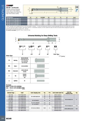 GUNDRILLS GD-DH (continued) BD Gundrills Carrying Triangular DC 0 -0.07 DCONMSh6 Inserts with 3 Chip Splitting Cutting Edges and a Wiper for LU High Hole Surface Quality PL LF LS Designation DC LU DCONMS BD LF PL LS Insert GD-DH 30.00-20D-M40-13 30.00 624.57 40.00 29.00 693.0 4.57 69.0 TOGT 13.. GD-DH 31.00-10D-M40-13 31.00 314.57 40.00 29.00 383.0 4.57 69.0 TOGT 13.. GD-DH 31.00-20D-M40-13 31.00 624.57 40.00 29.00 693.0 4.57 69.0 TOGT 13.. GD-DH 32.00-10D-M40-13 32.00 324.57 40.00 30.00 395.0 4.57 69.0 TOGT 13.. GD-DH 32.00-20D-M40-13 32.00 644.57 40.00 30.00 715.0 4.57 69.0 TOGT 13.. • Note: Gundrills can be supplied with up to 2400 mm length on request. • Inserts and guide pads should be ordered separately (they are not included with the tools). • For user guide and cutting conditions, see pages 289-292 • Preventative measures: Do NOT operate the deep hole drill at full speed before engaging the guide hole. Enter the guide hole slowly at a speed of 50 - 100 rpm. For inserts, see pages: TOGT-DT (194) • TOGT-GF (194) 286 ISCAR
