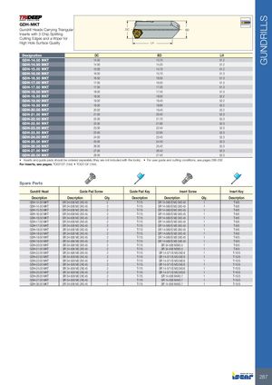GUNDRILLS GDH-MKT Gundrill Heads Carrying Triangular DC BD Inserts with 3 Chip Splitting Cutting Edges and a Wiper for High Hole Surface Quality LH Designation DC BD LH GDH-14.00 MKT 14.00 13.70 51.2 GDH-14.50 MKT 14.50 14.20 51.2 GDH-15.00 MKT 15.00 14.70 51.2 GDH-16.00 MKT 16.00 15.70 51.3 GDH-16.50 MKT 16.50 16.00 51.3 GDH-17.00 MKT 17.00 16.50 51.3 GDH-17.50 MKT 17.50 17.20 51.3 GDH-18.00 MKT 18.00 17.40 51.3 GDH-18.50 MKT 18.50 18.00 52.2 GDH-19.00 MKT 19.00 18.40 52.2 GDH-19.50 MKT 19.50 18.90 52.2 GDH-20.00 MKT 20.00 19.40 52.2 GDH-21.00 MKT 21.00 20.40 52.3 GDH-22.00 MKT 22.00 21.70 52.3 GDH-22.50 MKT 22.50 21.90 52.3 GDH-23.00 MKT 23.00 22.40 52.3 GDH-23.50 MKT 23.50 22.90 52.3 GDH-24.00 MKT 24.00 23.40 52.3 GDH-25.00 MKT 25.00 24.40 52.3 GDH-26.00 MKT 26.00 25.40 52.3 GDH-27.00 MKT 27.00 26.40 52.3 GDH-28.00 MKT 28.00 27.40 52.3 • Inserts and guide pads should be ordered separately (they are not included with the tools). • For user guide and cutting conditions, see pages 289-292 For inserts, see pages: TOGT-DT (194) • TOGT-GF (194) Spare Parts Gundrill Head Guide Pad Screw Guide Pad Key Insert Screw Insert Key Description Description Qty. Description Description Qty. Description GDH-14.00 MKT SR 34-508 M2.2X0.45 2 T-7/5 SR 14-560/S M2.5X0.45 1 T-8/5 GDH-14.50 MKT SR 34-508 M2.2X0.45 2 T-7/5 SR 14-560/S M2.5X0.45 1 T-8/5 GDH-15.00 MKT SR 34-508 M2.2X0.45 2 T-7/5 SR 14-560/S M2.5X0.45 1 T-8/5 GDH-16.00 MKT SR 34-508 M2.2X0.45 2 T-7/5 SR 14-560/S M2.5X0.45 1 T-8/5 GDH-16.50 MKT SR 34-508 M2.2X0.45 2 T-7/5 SR 14-560/S M2.5X0.45 1 T-8/5 GDH-17.00 MKT SR 34-508 M2.2X0.45 2 T-7/5 SR 14-560/S M2.5X0.45 1 T-8/5 GDH-17.50 MKT SR 34-508 M2.2X0.45 2 T-7/5 SR 14-560/S M2.5X0.45 1 T-8/5 GDH-18.00 MKT SR 34-508 M2.2X0.45 2 T-7/5 SR 14-560/S M2.5X0.45 1 T-8/5 GDH-18.50 MKT SR 34-508 M2.2X0.45 2 T-7/5 SR 14-560/S M2.5X0.45 1 T-8/5 GDH-19.00 MKT SR 34-508 M2.2X0.45 2 T-7/5 SR 14-560/S M2.5X0.45 1 T-8/5 GDH-19.50 MKT SR 34-508 M2.2X0.45 2 T-7/5 SR 14-560/S M2.5X0.45 1 T-8/5 GDH-20.00 MKT SR 34-508 M2.2X0.45 2 T-7/5 SR 34-506 M3X0.5 1 T-8/5 GDH-21.00 MKT SR 34-508 M2.2X0.45 2 T-7/5 SR 34-506 M3X0.5 1 T-8/5 GDH-22.00 MKT SR 34-508 M2.2X0.45 2 T-7/5 SR 14-571/S M3.5X0.6 1 T-10/5 GDH-22.50 MKT SR 34-508 M2.2X0.45 2 T-7/5 SR 14-571/S M3.5X0.6 1 T-10/5 GDH-23.00 MKT SR 34-508 M2.2X0.45 2 T-7/5 SR 14-571/S M3.5X0.6 1 T-10/5 GDH-23.50 MKT SR 34-508 M2.2X0.45 2 T-7/5 SR 14-571/S M3.5X0.6 1 T-10/5 GDH-24.00 MKT SR 34-508 M2.2X0.45 2 T-7/5 SR 14-571/S M3.5X0.6 1 T-10/5 GDH-25.00 MKT SR 34-508 M2.2X0.45 2 T-7/5 SR 14-571/S M3.5X0.6 1 T-10/5 GDH-26.00 MKT SR 34-508 M2.2X0.45 2 T-7/5 SR 14-506 M4X0.7 1 T-15/5 GDH-27.00 MKT SR 34-508 M2.2X0.45 2 T-7/5 SR 14-506 M4X0.7 1 T-15/5 GDH-28.00 MKT SR 34-508 M2.2X0.45 2 T-7/5 SR 14-506 M4X0.7 1 T-15/5 287