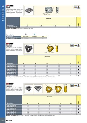 GUNDRILLS IC908IC908IC908 LOGT IC Deep Drilling Inserts with 2 Chip Splitting Cutting Edges, Positive Rake Chipbreaker and a Wiper RE PL Wiper S Dimensions Designation IC RE PL S LOGT 060204R-DT 7.00 0.40 1.80 2.00 • For tools, see pages: GD-DH (12-13.5) (283) • GD-DHL (284) Spare Parts Designation Insert Screw Insert key N*m LOGT 060204R-DT SR 10503833L040 T-7F 0.9 RE S TOGT-DT Deep Drilling Inserts with 3 Chip Splitting Cutting Edges, Positive Rake Chipbreaker and a Wiper IC PL Wiper Dimensions Designation IC RE PL S Fig. TOGT 070304-DT 7.69 0.40 1.95 2.30 1 • TOGT 080305-DT 8.55 0.50 2.20 2.80 1 • TOGT 090305-DT 8.32 0.50 3.00 3.00 2 • TOGT 100305-DT 9.23 0.50 3.20 3.30 2 • TOGT 110405-DT 10.40 0.50 3.40 3.80 2 • TOGT 120405-DT 11.59 0.50 3.60 4.30 2 • TOGT 130408-DT 12.85 0.80 4.57 4.76 2 • TOGT 140510-DT 16.85 1.00 5.43 5.26 2 • For tools, see pages: DDD-EF-FT (193) • DSD-EF-FT (192) • DSD-IF-FT (192) • GD-DH (285) • GDH-MKT (287) REFig. 1Fig. 2 S TOGT-GF Deep Drilling Inserts with 3 Chip Splitting Cutting Edges, Positive Rake Chipbreaker and a Wiper IC PL Wiper Dimensions Designation IC RE PL S Fig. TOGT 070304-GF 7.69 0.40 1.95 2.30 1 • TOGT 080305-GF 8.55 0.50 2.20 2.80 1 • TOGT 090305-GF 8.32 0.50 3.00 3.00 2 • TOGT 100305-GF 9.23 0.50 3.20 3.30 2 • TOGT 110405-GF 10.40 0.50 3.40 3.80 2 • TOGT 120405-GF 11.59 0.50 3.60 4.30 2 • TOGT 130408-GF 12.85 0.80 4.57 4.76 2 • For tools, see pages: DDD-EF-FT (193) • DSD-EF-FT (192) • DSD-IF-FT (192) • GD-DH (285) • GDH-MKT (287) 288 ISCAR