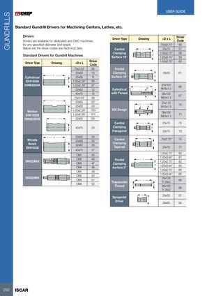 GUNDRILLS USER GUIDE Standard Gundrill Drivers for Machining Centers, Lathes, etc. DriversDrivers are available for dedicated and CNC machines, Driver Type Drawing øD x L DriverCode for any specified diameter and length. .750x2.75” 56 Below are the driver codes and technical data. Central L 25x70 57 Clamping 1.00x2.75” 58 Standard Drivers for Gundrill Machines DSurface 15°1.25x2.75”59 Driver Type Drawing øD x L DriverCode 1.50x2.75” 60 .75x2.03” 95 Frontal L 20x50 10 Clamping 16x50 61 LCylindrical 25x56 11 Surface 15° D DIN1835A D 1.00x2.28” 96 DIN6535HA 1.25x2.28” 9732x6012 Cylindrical L M 25x100M16x1.566 40x70 13 with Thread.75x2.03”99 D 36x120M24x1.567 L 20x50 2225x5623 LD M 25x112M16x1.570 Weldon D 1.00x2.28” 100 VDI DesignDIN1835B1.25x2.28”101 36x135M24x1.571 DIN6535HB L 32x60 24 Central L 25x70 72 D 40x70 25 Clamping D Hexagonal 32x70 73 LWhistle 20x50 3425x5635 Central L .75x2.75” 76 NotchDIN1835E 32x60 36D ClampingTapered D 20x70 77 40x70 37 CM1 45 1.00x2.75” 80 DIN228AK CM2 46CM347CM448 1.00x3.94” 81FrontalClampingSurface 2°L1.25x2.75”82D1.25x3.94”83 CM1 49 1.50x2.75” 84 DIN228BK CM2 50 1.50x3.94” 85CM351CM452LTrapezoidal28x126Tr 28x288ThreadTrD36x162Tr 36x289 LSpraymist 25x50 91 Driver D 35x60 92 292 ISCAR