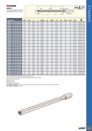 GUNDRILLS LPR MNSNT BD BDRED FLGT 11.5 Indexable SUMOCHAM Inserts and Modular Shank Gundrills DCk7 THSZMS PL DRVS GDV Driver LU Designation DCN(1) DCX(2) LU PL THSZMS BD BDRED LPR FLGT DRVS(3) SSC(4) MIID(5) MNSNT 100-200-MF16X1 10.00 10.40 200.00 2.720 MF16X1 9.70 9.60 274.00 10.00 16.0 10.0 HCP 100 K DCN 10-13.99 MNSNT 105-200-MF16X1 10.50 10.90 200.00 2.720 MF16X1 10.20 10.10 274.00 10.00 16.0 10.0 HCP 105 K DCN 10-13.99 MNSNT 110-200-MF16X1 11.00 11.40 200.00 2.750 MF16X1 10.70 10.60 275.00 10.00 16.0 11.0 HCP 110 K DCN 10-13.99 MNSNT 115-200-MF16X1 11.50 11.90 200.00 2.750 MF16X1 11.20 11.10 275.00 10.00 16.0 11.0 HCP 115 K DCN 10-13.99 MNSNT 120-200-MF16X1 12.00 12.40 200.00 3.160 MF16X1 11.70 11.60 275.00 10.00 16.0 12.0 HCP 120 K DCN 10-13.99 MNSNT 125-200-MF16X1 12.50 12.90 200.00 3.160 MF16X1 12.20 12.10 275.00 12.00 16.0 12.0 HCP 125 K DCN 10-13.99 MNSNT 130-200-MF16X1 13.00 13.40 200.00 3.510 MF16X1 12.70 12.60 276.00 12.00 16.0 13.0 HCP 130 K DCN 10-13.99 MNSNT 135-200-MF16X1 13.50 13.90 200.00 3.510 MF16X1 13.20 13.10 276.00 12.00 16.0 13.0 HCP 135 K DCN 10-13.99 MNSNT 140-200-MF16X1 14.00 14.40 200.00 3.630 MF16X1 13.70 13.60 276.00 12.00 16.0 14.0 HCP 140 K DCN 14-17.99 MNSNT 145-200-MF16X1 14.50 14.90 200.00 3.630 MF16X1 14.20 14.10 276.00 12.00 16.0 14.0 HCP 145 K DCN 14-17.99 MNSNT 130-250-MF16X1 13.00 13.40 250.00 3.510 MF16X1 12.70 12.60 326.00 12.00 16.0 13.0 HCP 130 K DCN 10-13.99 MNSNT 135-250-MF16X1 13.50 13.90 250.00 3.510 MF16X1 13.20 13.10 326.00 12.00 16.0 13.0 HCP 135 K DCN 10-13.99 MNSNT 140-250-MF16X1 14.00 14.40 250.00 3.630 MF16X1 13.70 13.60 326.00 12.00 16.0 14.0 HCP 140 K DCN 14-17.99 MNSNT 145-250-MF16X1 14.50 14.90 250.00 3.630 MF16X1 14.20 14.10 326.00 12.00 18.0 14.0 HCP 145 K DCN 14-17.99 MNSNT 100-400-MF16X1 10.00 10.40 400.00 2.720 MF16X1 9.70 9.60 474.00 10.00 16.0 10.0 HCP 100 K DCN 10-13.99 MNSNT 105-400-MF16X1 10.50 10.90 400.00 2.720 MF16X1 10.20 10.10 474.00 10.00 16.0 10.0 HCP 105 K DCN 10-13.99 MNSNT 110-400-MF16X1 11.00 11.40 400.00 2.750 MF16X1 10.70 10.60 474.00 10.00 16.0 11.0 HCP 110 K DCN 10-13.99 MNSNT 115-400-MF16X1 11.50 11.90 400.00 2.750 MF16X1 11.20 11.10 474.00 10.00 16.0 11.0 HCP 115 K DCN 10-13.99 MNSNT 120-400-MF16X1 12.00 12.40 400.00 3.160 MF16X1 11.70 11.60 475.00 10.00 16.0 12.0 HCP 120 K DCN 10-13.99 MNSNT 125-400-MF16X1 12.50 12.90 400.00 3.160 MF16X1 12.20 12.10 475.00 12.00 16.0 12.0 HCP 125 K DCN 10-13.99 MNSNT 130-400-MF16X1 13.00 13.40 400.00 3.510 MF16X1 12.70 12.60 476.00 12.00 16.0 13.0 HCP 130 K DCN 10-13.99 MNSNT 135-400-MF16X1 13.50 13.90 400.00 3.510 MF16X1 13.20 13.10 476.00 12.00 16.0 13.0 HCP 135 K DCN 10-13.99 MNSNT 140-400-MF16X1 14.00 14.40 400.00 3.630 MF16X1 13.70 13.60 476.00 12.00 16.0 14.0 HCP 140 K DCN 14-17.99 MNSNT 145-400-MF16X1 14.50 14.90 400.00 3.630 MF16X1 14.20 14.10 476.00 12.00 18.0 14.0 HCP 145 K DCN 14-17.99 MNSNT 150-400-MF16X1 15.00 15.90 400.00 3.880 MF16X1 14.70 14.60 484.00 12.00 18.0 15.0 HCP 150 K DCN 14-17.99 MNSNT 160-400-MF20X1 16.00 16.90 400.00 3.910 MF20X1 15.50 15.40 484.00 12.00 18.0 16.0 HCP 160 K DCN 14-17.99 MNSNT 170-400-MF20X1 17.00 17.90 400.00 4.570 MF20X1 16.50 16.40 485.00 12.00 22.0 17.0 HCP 170 K DCN 14-17.99 MNSNT 180-400-MF20X1 18.00 18.90 400.00 4.660 MF20X1 17.50 17.40 486.00 12.00 22.0 18.0 HCP 180 K DCN 14-17.99 MNSNT 190-400-MF20X1 19.00 19.90 400.00 4.660 MF20X1 18.50 18.40 486.00 12.00 22.0 19.0 HCP 190 K DCN 18-21.99 MNSNT 200-400-MF20X1 20.00 20.90 400.00 4.810 MF20X1 19.50 19.40 487.00 12.00 22.0 20.0 HCP 200 K DCN 18-21.99 MNSNT 210-400-MF20X1 21.00 21.90 400.00 4.940 MF20X1 20.50 20.40 503.00 21.00 28.0 21.0 HCP 210 K DCN 18-21.99 MNSNT 220-400-MF20X1 22.00 22.90 400.00 5.200 MF20X1 21.50 21.40 504.00 21.00 28.0 22.0 HCP 220 K DCN 18-21.99 MNSNT 230-400-MF20X1 23.00 23.90 400.00 5.280 MF20X1 22.50 22.40 504.00 21.00 28.0 23.0 HCP 230 K DCN 22-26.99 MNSNT 240-400-MF20X1 24.00 24.90 400.00 5.630 MF20X1 23.50 23.40 505.00 21.00 28.0 24.0 HCP 240 K DCN 22-26.99 MNSNT 250-400-MF20X1 25.00 25.90 400.00 5.700 MF20X1 24.50 24.40 506.00 21.00 28.0 25.0 HCP 250 K DCN 22-26.99 • For user guide and cutting conditions, see pages 294-297 (1) Do not mount smaller drilling heads than the specified range of the drill body (2) Cutting diameter maximum (3) Torque key size (4) Seat size code (5) Master insert identification For inserts, see pages: HCP-IQ (47) • ICG (57) • ICK (28) • ICK-2M (32) • ICP (18) • ICP-2M (24) • QCP-2M (43) For holders, see pages: GDV (294) 293
