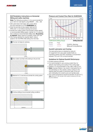 GUNDRILLS USER GUIDE Drill Penetration Instructions on Horizontal Pressure and Coolant Flow Rate for SUMOGUN Milling and Lathe machines Bar l/min Note: The following procedure (1-4) is recommended for 120 300 up to 400 mm hole depths using MNSNT ...-400... drill. 110 275 1 Drill a pilot hole 0.5xD deep with a short drill in 100 250 the same diameter as of the SUMOGUN drill. 90 225 2 Enter the pre-hole at slow speed, feed and 50 80 200 RPM until 1-2 mm before reaching the bottom. 7060 175150 3 Activate the cooling system and increase rotation speed 50 125 to recommended drilling speed, maintain for 2-3 seconds, 40 100 then continue at recommended drilling feed. No pecking 30 75 is required. Apply maximum possible coolant flow rate. 2010 5025 4 After having reached the required depth, reduce speed to 50-100 RPM while exiting from the hole. Ø 10 12 14 16 18 20 22 24 26 mm SUMOGUN DrillinSgUMRaOnGgUeN Drilling RangeDrillingDDriiallimngetDeirameter 1 Pre-hole 1xD deep for centering Q l/min P bar GUNDRILL Machines Milling and Turning Machines Gundrill Lubrication and Cooling The best performance is obtained by using oil. On equipment that uses water-soluble fluids (i.e. machining centers and CNC machines) a concentration 1xD between 10% and 15% is recommended. 2 Slow rotation and feed while entering to the pre-hole Guidelines for Optimal Gundrill Performance • Coolant pressure and flow • It is recommended to use a strong coolant flow for efficient chip flushing and cooling of the cutting edge • Filtration: It is recommended to use a filter under 20 µm. • Note: Improper filtration may result in interrupted flow of the lubricating oil. This creates a sticky surface on the bearing pads and leads to premature wear of the tool 1xD and overloading the coolant pump and spindle seals. 3 Maintain for 2-3 seconds and activate the cooling system • The coolant temperature should be between 20 and 22º C.Note: Above 50º C the viscosity of the coolant is reduced by 50% and becomes ineffective. 1xD 4 Continue drilling at recommended cutting conditions SUMOGUN 295