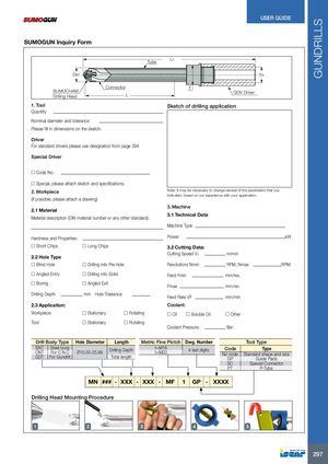 GUNDRILLS USER GUIDE SUMOGUN Inquiry Form Tube L1 Dk7 Th Connector T SUMOCHAMDrilling Head L GDV Driver 1. Tool Sketch of drilling application Quantity Nominal diameter and tolerance Please fill in dimensions on the sketch. Driver For standard drivers please use designation from page 294 Special Driver o Code No. o Special, please attach sketch and specifications. 2. Workpiece Note: It may be necessary to change several of the parameters that you indicated, based on our experience with your application. (If possible, please attach a drawing) 2.1 Material 3. Machine 3.1 Technical Data Material description (DIN material number or any other standard): Machine Type Hardness and Properties: Power: kW o Short Chips o Long Chips 3.2 Cutting Data: 2.2 Hole Type Cutting Speed Vc m/min o Blind Hole o Drilling into Pre-hole Revolutions Nmin RPM, Nmax RPM o Angled Entry o Drilling into Solid Feed Fmin mm/rev, o Boring o Angled Exit Fmax mm/rev Drilling Depth mm Hole Tolerance Feed Rate VF mm/min 2.3 Application: Coolant: Workpiece: o Stationary o Rotating o Oil o Soluble Oil o Other Tool: o Stationary o Rotating Coolant Pressure: Bar Drill Body Type Hole Diameter Length Metric Fine Pictch Dwg. Number Tool Type SNTCNT Steel bodyFor C.N.CØ10.00-25.99 Drilling DepthGDTFor GundrillTotal length1=M161=M204 last digitsCode TypeNo codeStandard shape and sizeGPGuide Pads SC Special Connector PT P-Tube MN ### - XXX - XXX - MF 1 GP - XXXX Drilling Head Mounting Procedure 1 2 3 4 5 297