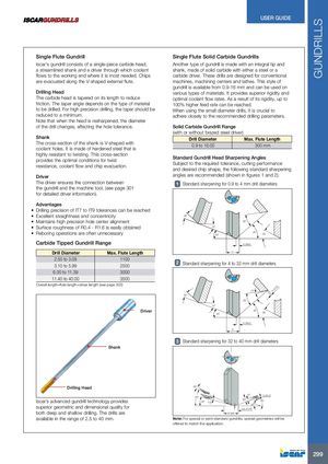GUNDRILLS USER GUIDE Single Flute Gundrill Single Flute Solid Carbide Gundrills Iscar's gundrill consists of a single-piece carbide head, Another type of gundrill is made with an integral tip and a streamlined shank and a driver through which coolant shank, made of solid carbide with either a steel or a flows to the working end where it is most needed. Chips carbide driver. These drills are designed for conventional are evacuated along the V-shaped external flute. machines, machining centers and lathes. This style of gundrill is available from 0.9-16 mm and can be used on Drilling Head various types of materials. It provides superior rigidity and The carbide head is tapered on its length to reduce optimal coolant flow rates. As a result of its rigidity, up to friction. The taper angle depends on the type of material 100% higher feed rate can be reached. to be drilled. For high precision drilling, the taper should be When using the small diameter drills, it is crucial to reduced to a minimum. adhere closely to the recommended drilling parameters. Note that when the head is resharpened, the diameter of the drill changes, affecting the hole tolerance. Solid Carbide Gundrill Range (with or without brazed steel driver) Shank Drill Diameter Max. Flute Length The cross-section of the shank is V-shaped withcoolant holes. It is made of hardened steel that is 0.9 to 16.00 300 mm highly resistant to twisting. This cross-section provides the optimal conditions for twistresistance, coolant flow and chip evacuation.Standard Gundrill Head Sharpening AnglesSubject to the required tolerance, cutting performanceand desired chip shape, the following standard sharpening Driver angles are recommended (shown in figures 1 and 2). The driver ensures the connection between 1 Standard sharpening for 0.9 to 4 mm drill diameters the gundrill and the machine tool, (see page 301 for detailed driver information). Advantages • Drilling precision of IT7 to IT9 tolerances can be reached • Excellent straightness and concentricity 30˚ • Maintains high precision hole center alignment 30˚ • Surface roughness of R0.4 - R1.6 is easily obtained 15˚ • Reboring operations are often unnecessary 40˚30˚ 35˚ Carbide Tipped Gundrill Range 0.25xD Drill Diameter Max. Flute Length D 2.50 to 3.09 11003.10 to 5.992500 2 Standard sharpening for 4 to 32 mm drill diameters 6.00 to 11.39 3000 11.40 to 40.00 3500 Overall length=flute length+driver length (see page 303) 12˚ 0.3-0.5 30˚ 20˚ 12˚ Driver 30˚20˚ 25˚ 0.25xD D 3 Standard sharpening for 32 to 40 mm drill diameters Shank Drilling Head 20° 25° 12° 0,3/0,5 Iscar’s advanced gundrill technology provides 15° 12° 20° 20° 25° superior geometric and dimensional quality for D/4 ±0,05 both deep and shallow drilling. The drills are Ø Dh5 available in the range of 2.5 to 40 mm. Note: For special or semi-standard gundrills, special geometries will be offered to match the application. 299