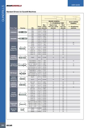 GUNDRILLS USER GUIDE Standard Drivers for Gundrill Machines F F BRAZED GUNDRILL SOLID CARBIDE F = CYLINDRICAL TUBE GUNDRILL Max. Equal or less More Driver cutting than max. cutting than max. F = Straightening Driver Type Drawing DXL code diameter diameter diameter extension CM1 N°45 9.599 10 20 DIN228AK CM2 N°46 14.599 10 20CM3N°4721.4991025 CM4 N°48 29.499 10 25 CM1 N°49 9.599 10 20 DIN228BK CM2 N°50 14.599 10 20CM3N°5121.4991025 CM4 N°52 29.499 10 25 6x30 N°53 2.749 10 20 20 10x40 N°54 7.299 10 20 15 CentralClampingSurface 15° 16x45 N°55 12.399L.750x2.75”N°5614.899D25x70N°5719.5091.00x2.75”N°5819.5091010101020202525 1.25x2.75” N°59 25.609 10 25 1.50x2.75” N°60 32.609 10 25 Frontal L Clamping D 16x50 N°61 12.399 10 20 Surface 15° 10x50 M6X0.5 N°62 7.299 10 20 15 10x60 M6X0.5 N°63 7.299 10 20 Cylindrical L M .50x1.97” M6x0.5 N°64 8.999 10 20 15 with Thread D 16x80 M10X1 N°65 12.399 10 20 15 25x100 M16x1.5 N°66 19.509 10 25 36x120 M24x1.5 N°67 30.609 10 25 L 10x68 M6x0.5 N°68 6.749 10 20 VDI Design D M 16x90 M10x1 N°69 10.79925x112 M16x1.5N°7019.5091010 2025 15 36x135 M24x1.5 N°71 30.609 10 25 Central L 25x70 N°72 19.509 10 25 ClampingHexagonal D 32x70 N°73 25.609 10 25 CentralClampingTapered .50x1.50” N°74 8.599L16x70N°7512.099D.75x2.75”N°7614.09920x70N°7716.0991010101020202020151515 .50x1.50” N°78 9.699 10 20 .75x2.75” N°79 14.899 10 20 FrontalClampingSurface 2° 1.00x2.75” N°80 19.509L1.00x3.94”N°8119.509D1.25x2.75”N°8225.6091.25x3.94”N°8325.6091010101025252525 1.50x2.75” N°84 32.609 10 25 1.50x3.94” N°85 32.609 10 25 16x112 Tr 16x1.5 N°86 13.599 10 20 Trapezoidal L 20x126 Tr 20x2 N°87 17.099 10 20 Thread Tr D 28x126 Tr 28x2 N°88 25.599 10 25 36x162 Tr 36x2 N°89 32.599 10 25 Spraymist L DDriver 16x40 N°90 12.39925x50N°9119.50935x60N°9226.599101010 202525 302 ISCAR