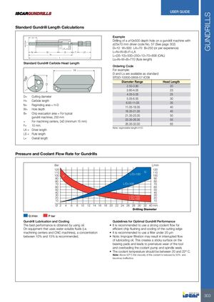 GUNDRILLS USER GUIDE Standard Gundrill Length Calculations H Example Drilling of a ø10x500 depth hole on a gundrill machine with D ø25x70 mm driver code No. 57 (See page 302) D=10 W=500 LA=70 B=250 (or per experience) N W B F LA L=N+W+B+F+LA Ls L=(35-10)+500+250+13+70=858 (OAL) L Ls=N+W+B=770 (flute length) Standard Gundrill Carbide Head Length Ordering Code H For example: D and Ls are available as standard STGD-10000-0858-57-IC08 Diameter Range Head Length D 2.50-3.80 20 3.80-4.05 23 4.05-5.05 25 D= Cutting diameter 5.05-6.55 30 H= Carbide length 6.55-11.05 35 N= Regrinding area = H-D 11.05-18.35 40 W= Hole depth 18.35-21.35 45 B= Chip evacuation area = For typicalgundrill machines, 250 mm 21.35-23.35 50 = For machining centers, 2xD (minimum 15 mm) 23.35-26.35 55 F= 10 mm. 26.35-32.00 65 Note: regrindable length=H-D LA = Driver length LS = Flute length L= Overall length Pressure and Coolant Flow Rate for Gundrills Bar L/min 120 120 110100 P QL/D>100110100 90 90 80 80 70 L/D<100 70 60 60 50 50 40 40 302010 L/D>100L/D<100 302010 Ø 2 4 6 8 10 12 14 16 18 20 22 24 26 28 30 32 40 mm Drilling Diameter Q l/min P bar Gundrill Lubrication and Cooling Guidelines for Optimal Gundrill Performance The best performance is obtained by using oil. • It is recommended to use a strong coolant flow for On equipment that uses water-soluble fluids (i.e. efficient chip flushing and cooling of the cutting edge machining centers and CNC machines), a concentration • It is recommended to use a filter under 20 µm between 10% and 15% is recommended. • Note: Improper filtration may result in interrupted flow of lubricating oil. This creates a sticky surface on the bearing pads and leads to premature wear of the tool and overloading the coolant pump and spindle seals • The coolant temperature should be between 20 and 22º C. Note: Above 50º C the viscosity of the coolant is reduced by 50% and becomes ineffective. 303