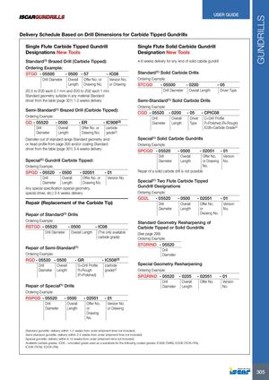GUNDRILLS USER GUIDE Delivery Schedule Based on Drill Dimensions for Carbide Tipped Gundrills Single Flute Carbide Tipped Gundrill Single Flute Solid Carbide Gundrill Designations New Tools Designation New Tools Standard(1) Brazed Drill (Carbide Tipped): 4-6 weeks delivery for any kind of solid cabide gundrill Ordering Example: STGD - 05500 - 0500 - 57 - IC08 Standard(1) Solid Carbide Drills Drill Diameter Overall Offer No. or Version No. Ordering Example: Length Drawing No. or Drawing STCGD - 05500 - 0200 - 05 Ø2.5 to Ø20 each 0.1 mm and Ø20 to Ø32 each 1 mm Drill Diameter Overall Length Driver Type Standard geometry suitable in any material Standard driver from the table (page 301) 1-2 weeks delivery Semi-Standard(1) Solid Carbide Drills Ordering Example: Semi-Standard(1) Brazed Drill (Carbide Tipped): CGD - 05520 - 0200 - 05 - CPIC08 Ordering Example: Drill Overall Driver C=Drill Profile GD - 05520 - 0500 - ER - IC908(2) Diameter Length Type P=Polished (R=Rough) Drill Overall Offer No. or carbide IC08=Carbide Grade(2) Diameter Length Drawing No. grade(2) Diameter out of standard range Standard geometry and/ Special(1) Solid Carbide Gundrills or head profile from page 300 and/or coating Standard Ordering Example: driver from the table (page 301) 3-4 weeks delivery SPCGD - 05520 - 0500 - 02051 - 01 Drill Overall Offer No. Version Special(1) Gundrill Carbide Tipped: Diameter Length or Drawing No. Ordering Example: No. SPGD - 05520 - 0500 - 02051 - 01 Repair of a solid carbide drill is not possible Drill Overall Offer No. or Version No.DiameterLengthDrawing No.Special(1) Two Flute Carbide Tipped Any special specification (special geometry, Gundrill Designations special driver, etc.) 3-4 weeks delivery Ordering Example: GD2L - 05520 - 0500 - 02051 - 01 Repair (Replacement of the Carbide Tip) Drill Overall Offer No. Version Diameter Length or No. Repair of Standard(1) Drills Drawing No. Ordering Example: Standard Geometry Resharpening of RSTGD - 05520 - 0500 - IC08 Carbide Tipped or Solid Gundrills Drill Diameter Overall Length (The only available (See page 299) carbide grade) Ordering Example: STGRIND - 05520 Repair of Semi-Standard(1) Drill Ordering Example: Diameter RGD - 05520 - 0500 - GR - IC508(2) Drill Overall G=Drill Profile (carbide Special Geometry Resharpening Diameter Length R=Rough grade)(2) Ordering Example: (P=Polished) SPGRIND - 05520 - 0205 - 02051 - 01 Drill Overall Offer No. Version Repair of Special(1) Drills Diameter Length No. Ordering Example: RSPGD - 05520 - 0500 - 02051 - 01 Drill Overall Offer No. Version No. Diameter Length or or Drawing Drawing No. Standard gundrills: delivery within 1-2 weeks from order (shipment time not included). Semi-standard gundrills: delivery within 2-4 weeks from order (shipment time not included) Special gundrills: delivery within 8-10 weeks from order (shipment time not included) Available carbide grades: IC08 – uncoated grade used as a substrate for the following coated grades: IC908 (TiAlN); IC508 (TiCN+TiN); IC308 (TiCN); IC208 (TiN) 305