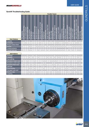 309 +++++++++++++Cratering +++++++++++++++Built-up edge ++++++++++++++++++Damaged wear pad ++++++++++++++++Flute bending ++++++++++++Drill heat ++++++++++++++Excessive flank wear ++++++++++++++Excessive corner wear +++++++++++++Excessive margin wear +++++++++++++++++++++++++++++++Poor drill life +++++++++Chipping ++++++++++++++++++++++++++Breakage Drill Problems +++++++++++++++++++Curved hole axis ++++++Conical entrance ++++++++++++++++++++++++Runout ++++++++++++++++++++++Rough surface finish +++++++++Undersize +++++++++++++++++Oversize Hole Problems Possible Causes Gundrill Troubleshooting Guide USER GUIDE Poor clamping Insufficient coolant flow Low coolant pressure Incorrect coolant type Feed fluctuations Too high feed Too low feed Spindle speed too high Spindle speed too low Material structure Material shrinking due to heat Workpiece thin wall section Misalignment Undersized hole Rough cutting edge finish Built up edge Worn out edge Interrupted chip flow Too small flute clearance Incorrect drill profile Incorrect head angles Vibrations Oversized bushing A gap between bushing and workpiece Bushing undersize Loss of coolant pressure High coolant pressure Overheating coolant Insufficent coolant Head inside angle excessive wear Head outside angle excessive wear Too short carbide head Tool heal drag Worn supporting pads GUNDRILLS
