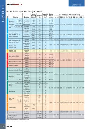 GUNDRILLS ISO USER GUIDE Gundrill Recommended Machining Conditions Tensile Material CuttingStrengthHardnessGroupSpeed vcFeed (mm/rev) vs. Drill Diameter (mm) Material Condition [N/mm2] HB No.(1) m/min 2.0-9.79 9.8-11.69 11.7-13.19 13.2-16.19 16.2-40 < 0.25 %C Annealed 420 125 1 70-110 Non-alloy >= 0.25 %C Annealed 650 190 2 80-110 steel andcast steel,< 0.55 %C Quenchedand tempered 850 250 3 70-100 0.01-0.03 0.03-0.05 0.035-0.06 0.04-0.07 0.02-0.10 free cutting >= 0.55 %C Annealed 750 220 4 70-110 steel Quenchedand tempered 1000 300 5 70-90 Annealed 600 200 6 80-110 P Low alloy and cast 930 275 7 70-110 steel (less than 5% ofalloying elements)Quenchedand tempered1000300 0.01-0.03 0.03-0.05 0.035-0.06 0.04-0.07 0.02-0.10860-90 1200 350 9 50-80 Annealed 680 200 10 50-70 0.01-0.03 0.025-0.04 0.03-0.045 0.035-0.05 0.12-0.10 High alloyed steel, cast steel and tool steel Quenchedand tempered 1100 325 11 Stainless steel Ferritic/martensitic 680 200 12 40-70 0.01-0.03 0.025-0.04 0.03-0.045 0.035-0.05 0.12-0.10 and cast steel Martensitic 820 240 13 M Stainless steeland cast steel Austenitic,duplex 600 180 14 40-80 0.01-0.03 0.025-0.04 0.03-0.045 0.035-0.05 0.02-0.10 Ferritic/Grey cast iron (GG)pearliticPearlitic/martensitic1801570-1002601670-100 K Ferritic 160 17 80-110 0.01-0.40 0.04-0.1 0.05-0.12 0.06-0.14 0.05-0.20 Nodular cast iron (GGG) Pearlitic 250 18 80-110 Ferritic 130 19 90-115 Malleable cast iron Pearlitic 230 20 90-115 NotAluminum-wrought alloyshardenable60 21 Hardenable 100 22 <=12% Si Nothardenable 80-16075230.02-0.040.03-0.17 0.03-0.18 0.035-0.19 0.03-0.15 Aluminum-cast alloys Hardenable 90 24 N >12% Si Hightemperature 130 25 80-120 >1% Pb Free cutting 110 26 Copper Brass 90 27 alloys Electroliticcopper 100 28 80-180 0.02-0.04 0.02-0.13 0.03-0.16 0.04-0.18 0.03-0.15 Duroplastics,Non-metallicfiber plastics 29 Hard rubber 30 Annealed 200 31 Fe based Hardened 280 32 High temp.alloysS Ni or CobasedAnnealedHardenedCast 250 33350343203525-600.01-0.03 0.025-0.03 0.03-0.035 0.03-0.04 0.02-0.10 Pure 400 36 Titanium alloys Alpha+beta alloys 1050 37 hardened Hardened 55 HRC 38 20-50 0.025-0.03 0.03-0.035 0.03-0.04 Hardened steel Hardened 60 HRC 39 H 0.01-0.03 0.02-0.10 Chilled cast iron Cast 400 40 Cast iron Hardened 55 HRC 41 (1) For workpiece materials list, see pages 495-524 310 ISCAR