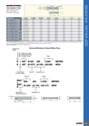 DEEP DRILLING - BTA SYSTEM LSCWS LSCWS TDO-I (D65.00-171.99) DCONMS DCONWS Outer Tube Double Tube Drill Systemwith 4-Start Thread L min max Connection Outer Tubes d Inner Tube L min max Designation d Range DCONMS DCONWS LSCWS Int Tube d L min L max TDO-I14 L=(0-3700)MM 65.00-66.99 56.00 52.00 75.00 TDI-N14 40.00 0.0 660.0 TDO-I15 L=(0-2950)MM 67.00-72.99 62.00 58.00 75.00 TDI-N15 44.00 0.0 660.0 TDO-I16 L=(0-3700)MM 73.00-79.99 68.00 63.00 75.00 TDI-N16 48.00 0.0 630.0 TDO-I17 L=(0-3700)MM 80.00-86.99 75.00 70.00 97.00 TDI-N17 54.00 0.0 630.0 TDO-I18 L=(0-3700)MM 87.00-99.99 82.00 77.00 97.00 TDI-N18 60.00 0.0 630.0 TDO-I19 L=(0-3700)MM 100.00-111.99 94.00 89.00 97.00 TDI-N19 70.00 0.0 630.0 TDO-I20 L=(0-3700)MM 112.00-123.99 106.00 101.00 118.00 TDI-N20 80.00 0.0 630.0 TDO-I21 L=(0-630)MM 124.00-135.99 118.00 113.00 118.00 TDI-N21 80.00 0.0 630.0 TDO-I21 L=(631-1070)MM 124.00-135.99 118.00 113.00 118.00 TDI-N21 80.00 631.0 1070.0 TDO-I22 L=(0-630)MM 136.00-147.99 130.00 125.00 118.00 TDI-N22 90.00 0.0 630.0 TDO-I22 L=(631-1070)MM 136.00-147.99 130.00 125.00 118.00 TDI-N22 90.00 631.0 1070.0 TDO-I23 L=(0-630)MM 148.00-159.99 142.00 137.00 139.00 TDI-N23 100.00 0.0 630.0 TDO-I23 L=(631-1070)MM 148.00-159.99 142.00 137.00 139.00 TDI-N23 100.00 631.0 1070.0 TDO-I24 L=(0-630)MM 160.00-171.99 154.00 149.00 139.00 TDI-N24 120.00 0.0 630.0 TDO-I24 L=(631-1070)MM 160.00-171.99 154.00 149.00 139.00 TDI-N24 120.00 631.0 1070.0 • Indicate overall length (L) when ordering • Ordering example: TDO-I18-L1150 • For 65.00-123.99 diameter range, the inner tube should be 190 mm longer than the outer tube. • For 124.00-183.99 diameter range, the inner tube should be 220 mm longer than the outer tube. For tools, see pages: DDC-EC (249) • DDD-EC (211) Double Tube Universal Marking for Deep Drilling Tools system 1ST : Single-start thread 2ST : Double-start thread 4ST : Four-start thread Tube L D I 4ST D.425 d39 L1600 METRIC D I 4ST D1.673 d1.535 L62.992 INCH I : Inner Thread Tube ØD Thread Pilot Ød O : Outer Thread Tube ØD Tube L DSLTI D32 d30 L1630 METRIC DSLTII D1.260 d1.181 L64.173 INCH Inner Tube for Thread Pilot Ød Double tube system DCONWS DCONMS d D5 d LSCWS L min max L min max L min max 267