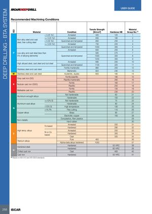 DEEP DRILLING - BTA SYSTEM ISO USER GUIDE Recommended Machining Conditions Tensile Strength Material Material Condition [N/mm2] Hardness HB Group No.(1) < 0.25 %C Annealed 420 125 1 >= 0.25 %C Annealed 650 190 2 Non-alloy steel and caststeel, free cutting steel< 0.55 %CQuenched and tempered 850 250 3 >= 0.55 %C Annealed 750 220 4 Quenched and tempered 1000 300 5 Annealed 600 200 6 P Low alloy and cast steel (less than 930 275 7 5% of alloying elements) Quenched and tempered 1000 300 8 1200 350 9 Annealed 680 200 10 High alloyed steel, cast steel and tool steel Quenched and tempered 1100 325 11 Stainless steel and cast steel Ferritic/martensitic 680 200 12 Martensitic 820 240 13 M Stainless steel and cast steel Austenitic, duplex 600 180 14 Ferritic/pearlitic 180 15 Grey cast iron (GG) Pearlitic/martensitic 260 16 K Nodular cast iron (GGG) FerriticPearlitic 160 1725018 Malleable cast iron FerriticPearlitic 130 1923020 Not hardenable 60 21 Aluminum-wrought alloys Hardenable 100 22 <=12% Si Not hardenable 75 23 Aluminum-cast alloys Hardenable 90 24 N >12% Si High temperature>1% PbFree cutting 130 2511026 Copper alloys Brass 90 27 Electrolitic copper 100 28 Non-metallic Duroplastics, fiber plasticsHard rubber 2930 Annealed 200 31 Fe based Hardened 280 32 High temp. alloys Annealed 250 33 S Ni or Cobased Hardened 350 34 Cast 320 35 Pure 400 36 Titanium alloys Alpha+beta alloys hardened 1050 37 Hardened steel Hardened 55 HRC 38Hardened60 HRC39 H Chilled cast iron Cast 400 40 Cast iron Hardened 55 HRC 41 (1) Based on ISO 513 and VDI 3323 standards 268 ISCAR