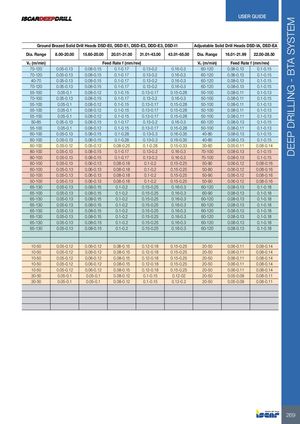 DEEP DRILLING - BTA SYSTEM USER GUIDE Ground Brazed Solid Drill Heads DSD-E0, DSD-E1, DSD-E3, DDD-E3, DSD-I1 Adjustable Solid Drill Heads DSD-IA, DSD-EA Dia. Range 8.00-20.00 15.60-20.00 20.01-31.00 31.01-43.00 43.01-65.00 Dia. Range 16.01-21.99 22.00-28.50 Vc (m/min) Feed Rate f (mm/rev) Vc (m/min) Feed Rate f (mm/rev) 70-120 0.05-0.13 0.08-0.15 0.1-0.17 0.13-0.2 0.16-0.3 60-120 0.08-0.13 0.1-0.15 70-120 0.05-0.13 0.08-0.15 0.1-0.17 0.13-0.2 0.16-0.3 60-120 0.08-0.13 0.1-0.15 40-70 0.05-0.13 0.08-0.15 0.1-0.17 0.13-0.2 0.16-0.3 60-120 0.08-0.13 0.1-0.15 70-120 0.05-0.13 0.08-0.15 0.1-0.17 0.13-0.2 0.16-0.3 60-120 0.08-0.13 0.1-0.15 55-100 0.05-0.1 0.08-0.12 0.1-0.15 0.13-0.17 0.15-0.28 50-100 0.08-0.11 0.1-0.13 70-100 0.05-0.13 0.08-0.15 0.1-0.17 0.13-0.2 0.16-0.3 50-100 0.08-0.11 0.1-0.15 55-100 0.05-0.1 0.08-0.12 0.1-0.15 0.13-0.17 0.15-0.28 50-100 0.08-0.11 0.1-0.13 55-100 0.05-0.1 0.08-0.12 0.1-0.15 0.13-0.17 0.15-0.28 50-100 0.08-0.11 0.1-0.13 55-100 0.05-0.1 0.08-0.12 0.1-0.15 0.13-0.17 0.15-0.28 50-100 0.08-0.11 0.1-0.13 50-85 0.05-0.13 0.08-0.15 0.1-0.17 0.13-0.2 0.16-0.3 60-120 0.08-0.13 0.1-0.15 55-100 0.05-0.1 0.08-0.12 0.1-0.15 0.13-0.17 0.15-0.28 50-100 0.08-0.11 0.1-0.13 60-100 0.05-0.13 0.08-0.15 0.1-0.28 0.13-0.3 0.16-0.35 40-80 0.08-0.13 0.1-0.15 60-100 0.05-0.13 0.08-0.15 0.1-0.28 0.13-0.3 0.16-0.35 40-80 0.08-0.13 0.1-0.15 60-100 0.05-0.12 0.05-0.12 0.08-0.25 0.1-0.28 0.15-0.33 30-60 0.05-0.11 0.08-0.14 80-100 0.05-0.13 0.08-0.15 0.1-0.17 0.13-0.2 0.16-0.3 70-100 0.08-0.13 0.1-0.15 80-100 0.05-0.13 0.08-0.15 0.1-0.17 0.13-0.2 0.16-0.3 70-100 0.08-0.13 0.1-0.15 60-100 0.05-0.13 0.06-0.13 0.08-0.18 0.1-0.2 0.15-0.25 50-90 0.06-0.12 0.08-0.16 60-100 0.05-0.13 0.06-0.13 0.08-0.18 0.1-0.2 0.15-0.25 50-80 0.06-0.12 0.08-0.16 50-100 0.05-0.13 0.06-0.13 0.08-0.18 0.1-0.2 0.15-0.25 50-90 0.06-0.12 0.08-0.16 50-100 0.05-0.13 0.06-0.13 0.08-0.18 0.1-0.2 0.15-0.25 50-90 0.06-0.12 0.08-0.16 65-130 0.05-0.13 0.08-0.15 0.1-0.2 0.15-0.25 0.16-0.3 60-120 0.08-0.13 0.1-0.18 65-100 0.05-0.13 0.08-0.15 0.1-0.2 0.15-0.25 0.16-0.3 60-90 0.08-0.13 0.1-0.18 65-130 0.05-0.13 0.08-0.15 0.1-0.2 0.15-0.25 0.16-0.3 60-120 0.08-0.13 0.1-0.18 65-130 0.05-0.13 0.08-0.15 0.1-0.2 0.15-0.25 0.16-0.3 60-120 0.08-0.13 0.1-0.18 65-130 0.05-0.13 0.08-0.15 0.1-0.2 0.15-0.25 0.16-0.3 60-120 0.08-0.13 0.1-0.18 65-130 0.05-0.13 0.08-0.15 0.1-0.2 0.15-0.25 0.16-0.3 60-120 0.08-0.13 0.1-0.18 65-130 0.05-0.13 0.08-0.15 0.1-0.2 0.15-0.25 0.16-0.3 60-120 0.08-0.13 0.1-0.18 65-130 0.05-0.13 0.08-0.15 0.1-0.2 0.15-0.25 0.16-0.3 60-120 0.08-0.13 0.1-0.18 10-50 0.05-0.12 0.06-0.12 0.08-0.15 0.12-0.18 0.15-0.25 20-50 0.06-0.11 0.08-0.14 10-50 0.05-0.12 0.06-0.12 0.08-0.15 0.12-0.18 0.15-0.25 20-50 0.06-0.11 0.08-0.14 10-50 0.05-0.12 0.06-0.12 0.08-0.15 0.12-0.18 0.15-0.25 20-50 0.06-0.11 0.08-0.14 10-50 0.05-0.12 0.06-0.12 0.08-0.15 0.12-0.18 0.15-0.25 20-50 0.06-0.11 0.08-0.14 10-50 0.05-0.12 0.06-0.12 0.08-0.15 0.12-0.18 0.15-0.25 20-50 0.06-0.11 0.08-0.14 30-50 0.05-0.1 0.05-0.1 0.08-0.12 0.1-0.15 0.12-02 20-50 0.05-0.09 0.08-0.11 30-50 0.05-0.1 0.05-0.1 0.08-0.12 0.1-0.15 0.12-0.2 20-50 0.05-0.09 0.08-0.11 269
