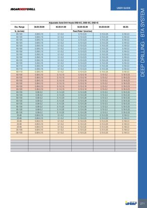 DEEP DRILLING - BTA SYSTEM USER GUIDE Adjustable Solid Drill Heads DSD-EC, DDD-EC, DSD-IC Dia. Range 38.00-39.99 40.00-51.99 52.00-63.99 64.00-84.99 85.00- Vc (m/min) Feed Rate f (mm/rev) 60-120 0.08-0.15 0.1-0.2 0.13-0.23 0.15-0.25 0.18-0.3 60-120 0.08-0.15 0.1-0.2 0.13-0.23 0.15-0.25 0.18-0.3 60-120 0.08-0.15 0.1-0.2 0.13-0.23 0.15-0.25 0.18-0.3 60-120 0.08-0.15 0.1-0.2 0.13-0.23 0.15-0.25 0.18-0.3 60-120 0.08-0.15 0.1-0.2 0.13-0.23 0.15-0.25 0.18-0.3 60-100 0.08-0.15 0.1-0.2 0.13-0.23 0.15-0.25 0.18-0.3 60-100 0.08-0.15 0.1-0.2 0.13-0.23 0.15-0.25 0.18-0.3 50-100 0.08-0.15 0.1-0.2 0.13-0.23 0.15-0.25 0.18-0.3 50-100 0.08-0.15 0.1-0.2 0.13-0.23 0.15-0.25 0.18-0.3 60-120 0.08-0.15 0.1-0.2 0.13-0.23 0.15-0.25 0.18-0.3 60-120 0.08-0.15 0.1-0.2 0.13-0.23 0.15-0.25 0.18-0.3 60-110 0.08-0.15 0.1-0.2 0.13-0.23 0.15-0.25 0.18-0.3 60-110 0.08-0.15 0.1-0.2 0.13-0.23 0.15-0.25 0.18-0.3 60-110 0.08-0.15 0.1-0.2 0.13-0.23 0.15-0.25 0.18-0.3 60-100 0.08-0.13 0.1-0.15 0.13-0.18 0.15-0.2 0.18-0.23 60-100 0.08-0.13 0.1-0.15 0.13-0.18 0.15-0.2 0.18-0.23 60-100 0.08-0.13 0.1-0.15 0.13-0.18 0.15-0.2 0.18-0.23 60-100 0.08-0.13 0.1-0.15 0.13-0.18 0.15-0.2 0.18-0.23 60-100 0.08-0.13 0.1-0.15 0.13-0.18 0.15-0.2 0.18-0.23 60-100 0.08-0.13 0.1-0.15 0.13-0.18 0.15-0.2 0.18-0.23 60-130 0.08-0.2 0.1-0.25 0.13-0.28 0.15-0.3 0.18-0.33 60-130 0.08-0.2 0.1-0.25 0.13-0.28 0.15-0.3 0.18-0.33 60-130 0.08-0.2 0.1-0.25 0.13-0.28 0.15-0.3 0.18-0.33 60-130 0.08-0.2 0.1-0.25 0.13-0.28 0.15-0.3 0.18-0.33 60-130 0.08-0.2 0.1-0.25 0.13-0.28 0.15-0.3 0.18-0.33 60-130 0.08-0.2 0.1-0.25 0.13-0.28 0.15-0.3 0.18-0.33 60-130 0.08-0.2 0.1-0.25 0.13-0.28 0.15-0.3 0.18-0.33 60-130 0.08-0.2 0.1-0.25 0.13-0.28 0.15-0.3 0.18-0.33 20-65 0.08-0.15 0.1-0.2 0.13-0.23 0.15-0.25 0.18-0.3 20-65 0.08-0.15 0.1-0.2 0.13-0.23 0.15-0.25 0.18-0.3 20-65 0.08-0.15 0.1-0.2 0.13-0.23 0.15-0.25 0.18-0.3 20-65 0.08-0.15 0.1-0.2 0.13-0.23 0.15-0.25 0.18-0.3 20-65 0.08-0.15 0.1-0.2 0.13-0.23 0.15-0.25 0.18-0.3 30-100 0.08-0.15 0.1-0.2 0.13-0.23 0.15-0.25 0.18-0.3 30-100 0.08-0.15 0.1-0.2 0.13-0.23 0.15-0.25 0.18-0.3 271