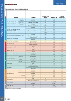 DEEP DRILLING - BTA SYSTEM ISO USER GUIDE Recommended Machining Conditions Tensile Strength Material Material Condition [N/mm2] Hardness HB Group No.(1) < 0.25 %C Annealed 420 125 1 >= 0.25 %C Annealed 650 190 2 Non-alloy steel and caststeel, free cutting steel< 0.55 %CQuenched and tempered 850 250 3 >= 0.55 %C Annealed 750 220 4 Quenched and tempered 1000 300 5 Annealed 600 200 6 P Low alloy and cast steel (less than 930 275 7 5% of alloying elements) Quenched and tempered 1000 300 8 1200 350 9 Annealed 680 200 10 High alloyed steel, cast steel and tool steel Quenched and tempered 1100 325 11 Ferritic/martensitic 680 200 12 Stainless steel and cast steel Martensitic 820 240 13 M Stainless steel and cast steel Austenitic, duplex 600 180 14 Ferritic/pearlitic 180 15 Grey cast iron (GG) Pearlitic/martensitic 260 16 Ferritic 160 17 K Nodular cast iron (GGG) Pearlitic 250 18 Ferritic 130 19 Malleable cast iron Pearlitic 230 20 Not hardenable 60 21 Aluminum-wrought alloys Hardenable 100 22 <=12% Si Not hardenable 75 23 Aluminum-cast alloys Hardenable 90 24 >12% Si High temperature 130 25 N >1% Pb Free cutting 110 26 Copper alloys Brass 90 27 Electrolitic copper 100 28 Duroplastics, fiber plastics 29 Non-metallic Hard rubber 30 Annealed 200 31 Fe based Hardened 280 32 High temp. alloys Annealed 250 33 S Ni or Co based Hardened 350 34 Cast 320 35 Pure 400 36 Titanium alloys Alpha+beta alloys hardened 1050 37 Hardened 55 HRC 38 Hardened steel Hardened 60 HRC 39 H Chilled cast iron Cast 400 40 Cast iron Hardened 55 HRC 41 (1) Based on ISO 513 and VDI 3323 standards 272 ISCAR