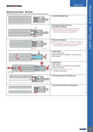 DEEP DRILLING - BTA SYSTEM USER GUIDE Technical Information - NC Cycle Use the NC cycle as instructed below to optimize tool performance more safely. 1. Start NC operation cycle 2. Oil pressure head moves until it touches the workpiece Set the starting point of the main axis of the tool so that the guide pad remains inside the guide bush when the oil pressure head moves forward. 3. Move tool workpiece Move the tool 3 to 5 mm from the edge of the workpiece. If the available NC machine can support this approach, the operation process may start from this point 3 ˜ 5 mm 4. Start cutting • Start coolant supply • Start rotating (tool / workpiece / tool & workpiece) • Start feeding 5. Stop cutting • Stop feeding • Stop rotating (tool / workpiece tool & workpiece) • Stop coolant supply Stop rotation when the outer tip is at the edge of the workpiece. 6. Tool main axis back to starting point 7. Oil pressure head back to starting point 275