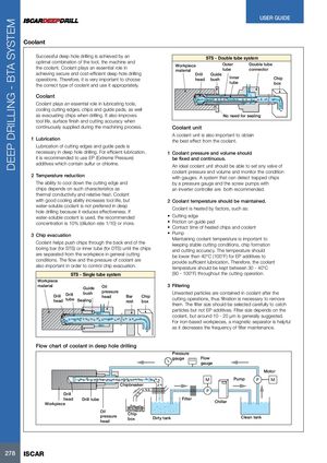 DEEP DRILLING - BTA SYSTEM USER GUIDE Coolant Successful deep hole drilling is achieved by an STS - Double tube system optimal combination of the tool, the machine andthe coolant. Coolant plays an essential role inWorkpieceOuter Double tubematerialtubeconnector achieving secure and cost-efficient deep hole drilling Drill Guide operations. Therefore, it is very important to choose head bush Inner Chip the correct type of coolant and use it appropriately. tube box Coolant Coolant plays an essential role in lubricating tools, cooling cutting edges, chips and guide pads, as well as evacuating chips when drilling. It also improves No need for sealing tool life, surface finish and cutting accuracy when continuously supplied during the machining process. Coolant unit A coolant unit is also important to obtain 1 Lubrication the best effect from the coolant. Lubrication of cutting edges and guide pads is necessary in deep hole drilling. For efficient lubrication, 1 Coolant pressure and volume should it is recommended to use EP (Extreme Pressure) be fixed and continuous. additives which contain sulfur or chlorine. An ideal coolant unit should be able to set any valve of coolant pressure and volume and monitor the condition 2 Temperature reduction with gauges. A system that can detect trapped chips The ability to cool down the cutting edge and by a pressure gauge and the screw pumps with chips depends on such characteristics as an inverter controller are both recommended. thermal conductivity and relative heat. Coolant with good cooling ability increases tool life, but 2 Coolant temperature should be maintained. water-soluble coolant is not preferred in deephole drilling because it reduces effectiveness. IfCoolant is heated by factors, such as: water-soluble coolant is used, the recommended • Cutting edge concentration is 10% (dilution rate 1/10) or more. • Friction on guide pad • Contact time of heated chips and coolant 3 Chip evacuation • Pump Maintaining coolant temperature is important to Coolant helps push chips through the back end of the keeping stable cutting conditions, chip formation boring bar (for STS) or inner tube (for DTS) until the chips and cutting accuracy. The temperature should are separated from the workpiece in general cutting be lower than 40°C (100°F) for EP additives to conditions. The flow and the pressure of coolant are provide sufficient lubrication. Therefore, the coolant also important in order to control chip evacuation. temperature should be kept between 30 - 40°C STS - Single tube system (90 - 100°F) throughout the cutting operation. Workpiece material Guide Oil 3 Filtering Drill Drill bushheadtubeSealingpressureheadBarChiprestbox Unwanted particles are contained in coolant after thecutting operations, thus filtration is necessary to remove them. The filter size should be selected carefully to catch particles but not EP additives. Filter size depends on the coolant, but around 10 - 20 μm is generally suggested. For iron-based workpieces, a magnetic separator is helpful as it decreases the frequency of filter maintenance. Flow chart of coolant in deep hole drilling Pressure gauge Flow gauge Motor M Pump P M Chipbreaker P Drill head Drill tubeWorkpiece Filter Chiller OilpressureheadChipbox Dirty tank Clean tank 278 ISCAR