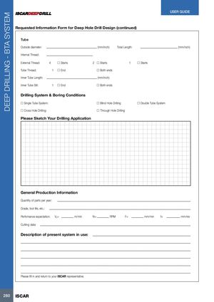 DEEP DRILLING - BTA SYSTEM USER GUIDE Requested Information Form for Deep Hole Drill Design (continued) Tube Outside diameter: (mm/inch) Total Length: (mm/inch) Internal Thread: External Thread: 4 o Starts 2 o Starts 1 o Starts Tube Thread: 1 o End o Both ends Inner Tube Length: (mm/inch) Inner Tube Slit: 1 o End o Both ends Drilling System & Boring Conditions o Single Tube System: o Blind Hole Drilling o Double Tube System o Cross Hole Drilling: o Through Hole Drilling Please Sketch Your Drilling Application General Production Information Quantity of parts per year: Grade, tool life, etc.: Perfomance expectation: Vc= m/min N= RPM F= mm/min f= mm/rev Cutting data: Description of present system in use: Please fill in and return to your ISCAR representative. 280 ISCAR