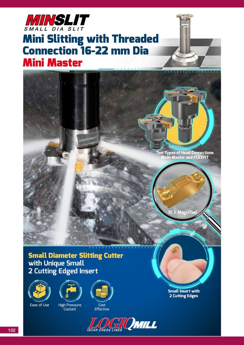 F O R I N T E R N A L U S E O N L Y • S U B J E C T T O C H A N G E MIN SLIT S M A L L D I A S L I T Mini Slitting with Threaded Connection 16-22 mm Dia Mini Master Two Types of Head Connections Multi-Master and FLEXFIT 10 X Magnified Small Diameter Slitting Cutter with Unique Small 2 Cutting Edged Insert Small Insert with 2 Cutting Edges Ease of Use High Pressure Cost Coolant Effective 102