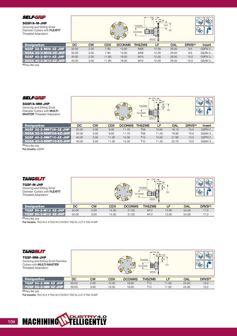 F O R I N T E R N A L U S E O N L Y • S U B J E C T T O C H A N G E OAL LF CW SGSF/A-M-JHP THSZMS CDX Grooving and Slitting Small Diameter Cutters with FLEXFIT DC DCONMS Threaded Adaptation DRVS Designation DC CW CDX DCONMS THSZMS LF OAL DRVS (1) Insert SGSF 32-2-M08-3Z-JHP 32.00 2.00 7.80 13.00 M08 12.00 29.50 9.6 GSFN 2... SGSA 32-3-M08-4Z-JHP 32.00 3.00 7.80 13.00 M08 12.00 29.50 9.6 GSAN 3... SGSF 40-2-M10-4Z-JHP 40.00 2.00 11.80 18.00 M10 12.00 29.50 15.0 GSFN 2... SGSA 40-3-M10-6Z-JHP 40.00 3.00 11.80 18.00 M10 12.00 29.50 15.0 GSAN 3... (1) Key flat size OAL LF CW SGSF/A-MM-JHP THSZMS Grooving and Slitting Small CDX Diameter Cutters with MULTI- DC DCONMS MASTER Threaded Adaptation DRVS Designation DC CW CDX DCONMS THSZMS LF OAL DRVS (1) Insert SGSF 32-2-MMT08-3Z-JHP 32.00 2.00 9.00 11.70 T08 10.60 18.10 10.0 GSFN 2... SGSA 32-3-MMT08-4Z-JHP 32.00 3.00 9.00 11.70 T08 11.40 18.90 10.0 GSAN 3... SGSF 40-2-MMT10-4Z-JHP 40.00 2.00 11.30 15.30 T10 10.60 21.90 13.0 GSFN 2... SGSA 40-3-MMT10-6Z-JHP 40.00 3.00 11.30 15.30 T10 11.40 22.70 13.0 GSAN 3... (1) Key flat size For inserts: GSFN OAL LF CW TGSF-M-JHP Grooving and Slitting Small THSZMS CDX Diameter Cutters with FLEXFIT DC Threaded Adaptation DCONMS DRVS Designation DC CW CDX DCONMS THSZMS LF OAL DRVS (1) TGSF 50-2-M12 5Z-JHP 50.00 2.00 14.30 21.00 M12 12.00 34.00 17.0 TGSF 50-3-M12 4Z-JHP 50.00 3.00 14.30 21.00 M12 12.00 34.00 17.0 (1) Key flat size For inserts: TAG N-A • TAG N-C/W/M • TAG N-J/JT • TAG N-MF OAL LF CW TGSF-MM-JHP THSZMS CDX Grooving and Slitting Small Diameter Cutters with MULTI-MASTER DCONMS DC Threaded Adaptation DRVS Designation DC CW CDX DCONMS THSZMS LF OAL DRVS (1) TGSF 50-2-MM 5Z JHP 50.00 2.00 15.30 19.00 T12 11.50 24.00 16.0 TGSF 50-3-MM 5Z JHP 50.00 3.00 15.30 19.00 T12 11.50 24.00 16.0 (1) Key flat size For inserts: TAG N-A • TAG N-C/W/M • TAG N-J/JT • TAG N-MF DUSTRY 4.0 104 MACHINING IN TELLIGENTLY