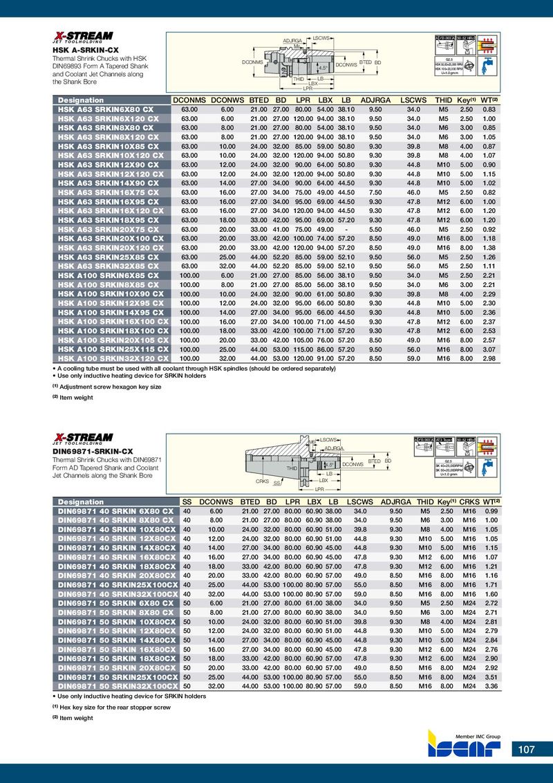 F O R I N T E R N A L U S E O N L Y • S U B J E C T T O C H A N G E F O R I N T E R N A L U S E O N L Y • S U B J E C T T O C H A N G E LSCWS A 0.003 A 50-52 HRc ADJRGA M6 HSK A-SRKIN-CX Thermal Shrink Chucks with HSK G2.5 DCONMS BTED DIN69893 Form A Tapered Shank DCONWS BD HSK 50,63=25,000 RPM 4.5° HSK 100=20,000 RPM and Coolant Jet Channels along U<1.0 gmm THID LB the Shank Bore LBX LPR Designation DCONMS DCONWS BTED BD LPR LBX LB ADJRGA LSCWS THID Key (1) WT (2) HSK A63 SRKIN6X80 CX 63.00 6.00 21.00 27.00 80.00 54.00 38.10 9.50 34.0 M5 2.50 0.83 HSK A63 SRKIN6X120 CX 63.00 6.00 21.00 27.00 120.00 94.00 38.10 9.50 34.0 M5 2.50 1.00 HSK A63 SRKIN8X80 CX 63.00 8.00 21.00 27.00 80.00 54.00 38.10 9.50 34.0 M6 3.00 0.85 HSK A63 SRKIN8X120 CX 63.00 8.00 21.00 27.00 120.00 94.00 38.10 9.50 34.0 M6 3.00 1.05 HSK A63 SRKIN10X85 CX 63.00 10.00 24.00 32.00 85.00 59.00 50.80 9.30 39.8 M8 4.00 0.87 HSK A63 SRKIN10X120 CX 63.00 10.00 24.00 32.00 120.00 94.00 50.80 9.30 39.8 M8 4.00 1.07 HSK A63 SRKIN12X90 CX 63.00 12.00 24.00 32.00 90.00 64.00 50.80 9.30 44.8 M10 5.00 0.90 HSK A63 SRKIN12X120 CX 63.00 12.00 24.00 32.00 120.00 94.00 50.80 9.30 44.8 M10 5.00 1.15 HSK A63 SRKIN14X90 CX 63.00 14.00 27.00 34.00 90.00 64.00 44.50 9.30 44.8 M10 5.00 1.02 HSK A63 SRKIN16X75 CX 63.00 16.00 27.00 34.00 75.00 49.00 44.50 7.50 46.0 M5 2.50 0.82 HSK A63 SRKIN16X95 CX 63.00 16.00 27.00 34.00 95.00 69.00 44.50 9.30 47.8 M12 6.00 1.00 HSK A63 SRKIN16X120 CX 63.00 16.00 27.00 34.00 120.00 94.00 44.50 9.30 47.8 M12 6.00 1.20 HSK A63 SRKIN18X95 CX 63.00 18.00 33.00 42.00 95.00 69.00 57.20 9.30 47.8 M12 6.00 1.20 HSK A63 SRKIN20X75 CX 63.00 20.00 33.00 41.00 75.00 49.00 - 5.50 46.0 M5 2.50 0.92 HSK A63 SRKIN20X100 CX 63.00 20.00 33.00 42.00 100.00 74.00 57.20 8.50 49.0 M16 8.00 1.18 HSK A63 SRKIN20X120 CX 63.00 20.00 33.00 42.00 120.00 94.00 57.20 8.50 49.0 M16 8.00 1.38 HSK A63 SRKIN25X85 CX 63.00 25.00 44.00 52.20 85.00 59.00 52.10 9.50 56.0 M5 2.50 1.26 HSK A63 SRKIN32X85 CX 63.00 32.00 44.00 52.20 85.00 59.00 52.10 9.50 56.0 M5 2.50 1.11 HSK A100 SRKIN6X85 CX 100.00 6.00 21.00 27.00 85.00 56.00 38.10 9.50 34.0 M5 2.50 2.21 HSK A100 SRKIN8X85 CX 100.00 8.00 21.00 27.00 85.00 56.00 38.10 9.50 34.0 M6 3.00 2.21 HSK A100 SRKIN10X90 CX 100.00 10.00 24.00 32.00 90.00 61.00 50.80 9.30 39.8 M8 4.00 2.29 HSK A100 SRKIN12X95 CX 100.00 12.00 24.00 32.00 95.00 66.00 50.80 9.30 44.8 M10 5.00 2.30 HSK A100 SRKIN14X95 CX 100.00 14.00 27.00 34.00 95.00 66.00 44.50 9.30 44.8 M10 5.00 2.36 HSK A100 SRKIN16X100 CX 100.00 16.00 27.00 34.00 100.00 71.00 44.50 9.30 47.8 M12 6.00 2.37 HSK A100 SRKIN18X100 CX 100.00 18.00 33.00 42.00 100.00 71.00 57.20 9.30 47.8 M12 6.00 2.53 HSK A100 SRKIN20X105 CX 100.00 20.00 33.00 42.00 105.00 76.00 57.20 8.50 49.0 M16 8.00 2.57 HSK A100 SRKIN25X115 CX 100.00 25.00 44.00 53.00 115.00 86.00 57.20 9.50 56.0 M16 8.00 3.07 HSK A100 SRKIN32X120 CX 100.00 32.00 44.00 53.00 120.00 91.00 57.20 8.50 59.0 M16 8.00 2.98 • A cooling tube must be used with all coolant through HSK spindles (should be ordered separately) • Use only inductive heating device for SRKIN holders (1) Adjustment screw hexagon key size (2) Item weight M6 LSCWS A 0.003 A AT3 Taper 50-52 HRc ADJRGA DIN69871-SRKIN-CX Thermal Shrink Chucks with DIN69871 BTED BD G2.5 4.5° DCONWS SK 40=25,000 RPM Form AD Tapered Shank and Coolant THID SK 50=20,000 RPM Jet Channels along the Shank Bore LB U<1.0 gmm CRKS LBX SS LPR Designation SS DCONWS BTED BD LPR LBX LB LSCWS ADJRGA THID Key (1) CRKS WT (2) DIN69871 40 SRKIN 6X80 CX 40 6.00 21.00 27.00 80.00 60.90 38.00 34.0 9.50 M5 2.50 M16 0.99 DIN69871 40 SRKIN 8X80 CX 40 8.00 21.00 27.00 80.00 60.90 38.00 34.0 9.50 M6 3.00 M16 1.00 DIN69871 40 SRKIN 10X80CX 40 10.00 24.00 32.00 80.00 60.90 51.00 39.8 9.30 M8 4.00 M16 1.05 DIN69871 40 SRKIN 12X80CX 40 12.00 24.00 32.00 80.00 60.90 51.00 44.8 9.30 M10 5.00 M16 1.05 DIN69871 40 SRKIN 14X80CX 40 14.00 27.00 34.00 80.00 60.90 45.00 44.8 9.30 M10 5.00 M16 1.15 DIN69871 40 SRKIN 16X80CX 40 16.00 27.00 34.00 80.00 60.90 45.00 47.8 9.30 M12 6.00 M16 1.07 DIN69871 40 SRKIN 18X80CX 40 18.00 33.00 42.00 80.00 60.90 57.00 47.8 9.30 M12 6.00 M16 1.21 DIN69871 40 SRKIN 20X80CX 40 20.00 33.00 42.00 80.00 60.90 57.00 49.0 8.50 M16 8.00 M16 1.16 DIN69871 40 SRKIN25X100CX 40 25.00 44.00 53.00 100.00 80.90 57.00 55.0 8.50 M16 8.00 M16 1.71 DIN69871 40 SRKIN32X100CX 40 32.00 44.00 53.00 100.00 80.90 57.00 59.0 8.50 M16 8.00 M16 1.60 DIN69871 50 SRKIN 6X80 CX 50 6.00 21.00 27.00 80.00 61.00 38.00 34.0 9.50 M5 2.50 M24 2.72 DIN69871 50 SRKIN 8X80 CX 50 8.00 21.00 27.00 80.00 60.90 38.00 34.0 9.50 M6 3.00 M24 2.71 DIN69871 50 SRKIN 10X80CX 50 10.00 24.00 32.00 80.00 60.90 51.00 39.8 9.30 M8 4.00 M24 2.81 DIN69871 50 SRKIN 12X80CX 50 12.00 24.00 32.00 80.00 60.90 51.00 44.8 9.30 M10 5.00 M24 2.79 DIN69871 50 SRKIN 14X80CX 50 14.00 27.00 34.00 80.00 60.90 45.00 44.8 9.30 M10 5.00 M24 2.84 DIN69871 50 SRKIN 16X80CX 50 16.00 27.00 34.00 80.00 60.90 45.00 47.8 9.30 M12 6.00 M24 2.76 DIN69871 50 SRKIN 18X80CX 50 18.00 33.00 42.00 80.00 60.90 57.00 47.8 9.30 M12 6.00 M24 2.90 DIN69871 50 SRKIN 20X80CX 50 20.00 33.00 42.00 80.00 60.90 57.00 49.0 8.50 M16 8.00 M24 2.92 DIN69871 50 SRKIN25X100CX 50 25.00 44.00 53.00 100.00 80.90 57.00 55.0 8.50 M16 8.00 M24 3.51 DIN69871 50 SRKIN32X100CX 50 32.00 44.00 53.00 100.00 80.90 57.00 59.0 8.50 M16 8.00 M24 3.36 • Use only inductive heating device for SRKIN holders (1) Hex key size for the rear stopper screw (2) Item weight 107