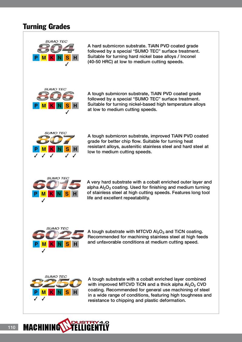 F O R I N T E R N A L U S E O N L Y • S U B J E C T T O C H A N G E Turning Grades A hard submicron substrate. TiAlN PVD coated grade followed by a special “SUMO TEC” surface treatment. Suitable for turning hard nickel base alloys / Inconel P M K N S H (40-50 HRC) at low to medium cutting speeds. 3 A tough submicron substrate, TiAlN PVD coated grade followed by a special “SUMO TEC” surface treatment. Suitable for turning nickel-based high temperature alloys P M K N S H at low to medium cutting speeds. 3 A tough submicron substrate, improved TiAlN PVD coated grade for better chip flow. Suitable for turning heat resistant alloys, austenitic stainless steel and hard steel at P M K N S H low to medium cutting speeds. 3 3 3 3 3 A very hard substrate with a cobalt enriched outer layer and alpha Al 2 O 3 coating. Used for finishing and medium turning of stainless steel at high cutting speeds. Features long tool P M K N S H life and excellent repeatability. 3 A tough substrate with MTCVD Al 2 O 3 and TiCN coating. Recommended for machining stainless steel at high feeds and unfavorable conditions at medium cutting speed. P M K N S H 3 A tough substrate with a cobalt enriched layer combined with improved MTCVD TiCN and a thick alpha Al 2 O 3 CVD coating. Recommended for general use machining of steel P M K N S H in a wide range of conditions, featuring high toughness and 3 3 resistance to chipping and plastic deformation. DUSTRY 4.0 110 MACHINING IN TELLIGENTLY