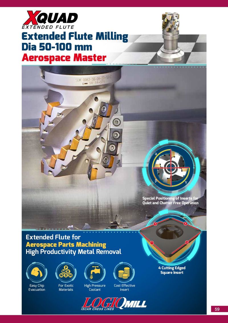 F O R I N T E R N A L U S E O N L Y • S U B J E C T T O C H A N G E F O R I N T E R N A L U S E O N L Y • S U B J E C T T O C H A N G E QUAD X E X T E N D E D F L U T E Extended Flute Milling Dia 50-100 mm Aerospace Master Special Positioning of Inserts for Quiet and Chatter Free Operation 4 3 Extended Flute for 1 2 Aerospace Parts Machining High Productivity Metal Removal 4 Cutting Edged Square Insert Easy Chip For Exotic High Pressure Cost Effective Evacuation Materials Coolant Insert 59