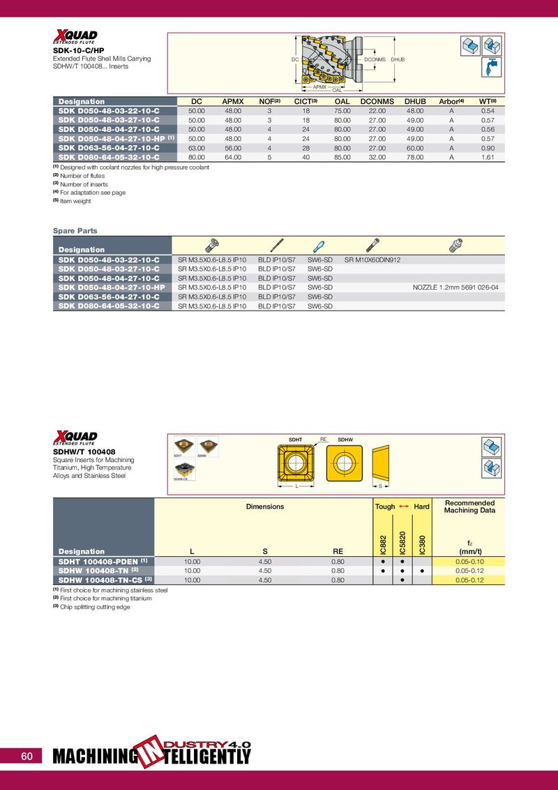 F O R I N T E R N A L U S E O N L Y • S U B J E C T T O C H A N G E SDK-10-C/HP Extended Flute Shell Mills Carrying DC DCONMS DHUB SDHW/T 100408... Inserts APMX OAL Designation DC APMX NOF (2) CICT (3) OAL DCONMS DHUB Arbor (4) WT (5) SDK D050-48-03-22-10-C 50.00 48.00 3 18 75.00 22.00 48.00 A 0.54 SDK D050-48-03-27-10-C 50.00 48.00 3 18 80.00 27.00 49.00 A 0.57 SDK D050-48-04-27-10-C 50.00 48.00 4 24 80.00 27.00 49.00 A 0.56 SDK D050-48-04-27-10-HP (1) 50.00 48.00 4 24 80.00 27.00 49.00 A 0.57 SDK D063-56-04-27-10-C 63.00 56.00 4 28 80.00 27.00 60.00 A 0.90 SDK D080-64-05-32-10-C 80.00 64.00 5 40 85.00 32.00 78.00 A 1.61 (1) Designed with coolant nozzles for high pressure coolant (2) Number of flutes (3) Number of inserts (4) For adaptation see page (5) Item weight Spare Parts Designation SDK D050-48-03-22-10-C SR M3.5X0.6-L8.5 IP10 BLD IP10/S7 SW6-SD SR M10X60DIN912 SDK D050-48-03-27-10-C SR M3.5X0.6-L8.5 IP10 BLD IP10/S7 SW6-SD SDK D050-48-04-27-10-C SR M3.5X0.6-L8.5 IP10 BLD IP10/S7 SW6-SD SDK D050-48-04-27-10-HP SR M3.5X0.6-L8.5 IP10 BLD IP10/S7 SW6-SD NOZZLE 1.2mm 5691 026-04 SDK D063-56-04-27-10-C SR M3.5X0.6-L8.5 IP10 BLD IP10/S7 SW6-SD SDK D080-64-05-32-10-C SR M3.5X0.6-L8.5 IP10 BLD IP10/S7 SW6-SD SDHT RE SDHW SDHW/T 100408 Square Inserts for Machining Titanium, High Temperature Alloys and Stainless Steel L S Recommended Dimensions Tough 1 Hard Machining Data f z Designation L S RE IC882 IC5820 IC380 (mm/t) SDHT 100408-PDEN (1) 10.00 4.50 0.80 • • 0.05-0.10 SDHW 100408-TN (2) 10.00 4.50 0.80 • • • 0.05-0.12 SDHW 100408-TN-CS (3) 10.00 4.50 0.80 • 0.05-0.12 (1) First choice for machining stainless steel (2) First choice for machining titanium (3) Chip splitting cutting edge DUSTRY 4.0 60 MACHINING IN TELLIGENTLY