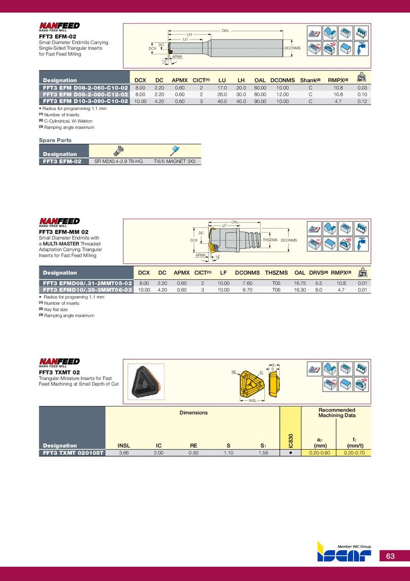 F O R I N T E R N A L U S E O N L Y • S U B J E C T T O C H A N G E F O R I N T E R N A L U S E O N L Y • S U B J E C T T O C H A N G E OAL LH FFT3 EFM-02 LU Small Diameter Endmills Carrying DC Rd° Single-Sided Triangular Inserts DCX DCONMS for Fast Feed Milling APMX 14˚ Designation DCX DC APMX CICT (1) LU LH OAL DCONMS Shank (2) RMPX (3) kg FFT3 EFM D08-2-060-C10-02 8.00 2.20 0.60 2 17.0 20.0 60.00 10.00 C 10.8 0.03 FFT3 EFM D08-2-080-C12-02 8.00 2.20 0.60 2 26.0 30.0 80.00 12.00 C 10.8 0.10 FFT3 EFM D10-3-090-C10-02 10.00 4.20 0.60 3 40.0 40.0 90.00 10.00 C 4.7 0.12 • Radius for programming 1.1 mm (1) Number of inserts (2) C-Cylindrical, W-Weldon (3) Ramping angle maximum Spare Parts Designation FFT3 EFM-02 SR M2X0.4-2.9 T6-HG T-6/5 MAGNET 3X3 OAL LF FFT3 EFM-MM 02 DC Small Diameter Endmills with DCX THSZMS DCONMS Rd° a MULTI-MASTER Threaded Adaptation Carrying Triangular Inserts for Fast Feed Milling APMX 14˚ Designation DCX DC APMX CICT (1) LF DCONMS THSZMS OAL DRVS (2) RMPX (3) kg FFT3 EFMD08/.31-2MMT05-02 8.00 2.20 0.60 2 10.00 7.60 T05 16.75 5.5 10.8 0.01 FFT3 EFMD10/.39-3MMT06-02 10.00 4.20 0.60 3 10.00 9.70 T06 16.30 8.0 4.7 0.01 • Radius for programing 1.1 mm (1) Number of inserts (2) Key flat size (3) Ramping angle maximum S1 S FFT3 TXMT 02 RE IC Triangular Miniature Inserts for Fast Rd° Feed Machining at Small Depth of Cut INSL Recommended Dimensions Machining Data a p f z Designation INSL IC RE S S 1 IC830 (mm) (mm/t) FFT3 TXMT 020105T 3.66 2.00 0.50 1.10 1.56 • 0.20-0.60 0.20-0.70 63