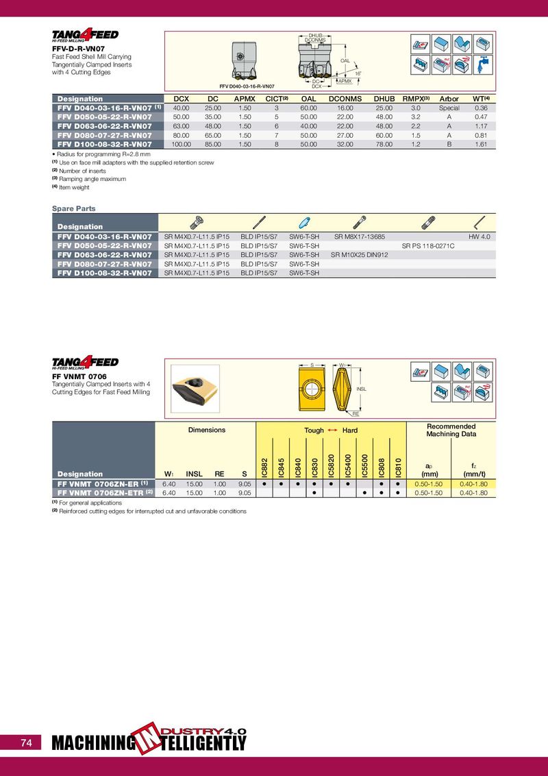 F O R I N T E R N A L U S E O N L Y • S U B J E C T T O C H A N G E DHUB DCONMS FFV-D-R-VN07 Fast Feed Shell Mill Carrying OAL Rd° Tangentially Clamped Inserts with 4 Cutting Edges 16˚ DC APMX FFV D040-03-16-R-VN07 DCX Designation DCX DC APMX CICT (2) OAL DCONMS DHUB RMPX (3) Arbor WT (4) FFV D040-03-16-R-VN07 (1) 40.00 25.00 1.50 3 60.00 16.00 25.00 3.0 Special 0.36 FFV D050-05-22-R-VN07 50.00 35.00 1.50 5 50.00 22.00 48.00 3.2 A 0.47 FFV D063-06-22-R-VN07 63.00 48.00 1.50 6 40.00 22.00 48.00 2.2 A 1.17 FFV D080-07-27-R-VN07 80.00 65.00 1.50 7 50.00 27.00 60.00 1.5 A 0.81 FFV D100-08-32-R-VN07 100.00 85.00 1.50 8 50.00 32.00 78.00 1.2 B 1.61 • Radius for programming R=2.8 mm (1) Use on face mill adapters with the supplied retention screw (2) Number of inserts (3) Ramping angle maximum (4) Item weight Spare Parts Designation FFV D040-03-16-R-VN07 SR M4X0.7-L11.5 IP15 BLD IP15/S7 SW6-T-SH SR M8X17-13685 HW 4.0 FFV D050-05-22-R-VN07 SR M4X0.7-L11.5 IP15 BLD IP15/S7 SW6-T-SH SR PS 118-0271C FFV D063-06-22-R-VN07 SR M4X0.7-L11.5 IP15 BLD IP15/S7 SW6-T-SH SR M10X25 DIN912 FFV D080-07-27-R-VN07 SR M4X0.7-L11.5 IP15 BLD IP15/S7 SW6-T-SH FFV D100-08-32-R-VN07 SR M4X0.7-L11.5 IP15 BLD IP15/S7 SW6-T-SH S W1 FF VNMT 0706 Tangentially Clamped Inserts with 4 lNSL Rd° Cutting Edges for Fast Feed Milling RE Recommended Dimensions Tough 1 Hard Machining Data a p f z Designation W 1 INSL RE S IC882 IC845 IC840 IC830 IC5820 IC5400 IC5500 IC808 IC810 (mm) (mm/t) FF VNMT 0706ZN-ER (1) 6.40 15.00 1.00 9.05 • • • • • • • • 0.50-1.50 0.40-1.80 FF VNMT 0706ZN-ETR (2) 6.40 15.00 1.00 9.05 • • • • 0.50-1.50 0.40-1.80 (1) For general applications (2) Reinforced cutting edges for interrupted cut and unfavorable conditions DUSTRY 4.0 74 MACHINING IN TELLIGENTLY